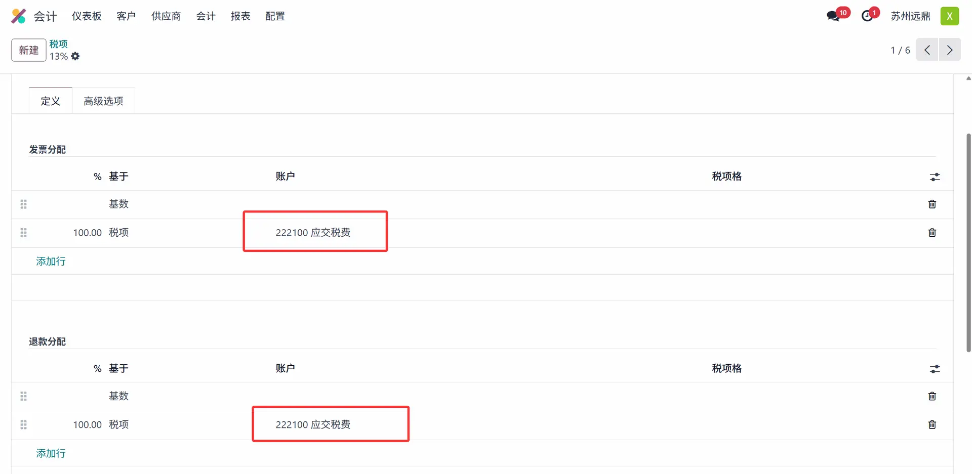 接下来是“应交税费账户”,应交税费账户本质上是负债科目。由于负债增加,该账户被贷记。在配置菜单下有一个“税项”子菜单。所有税项都列在那里。选择每个税项时,会正确注明过账税费分布的账户。