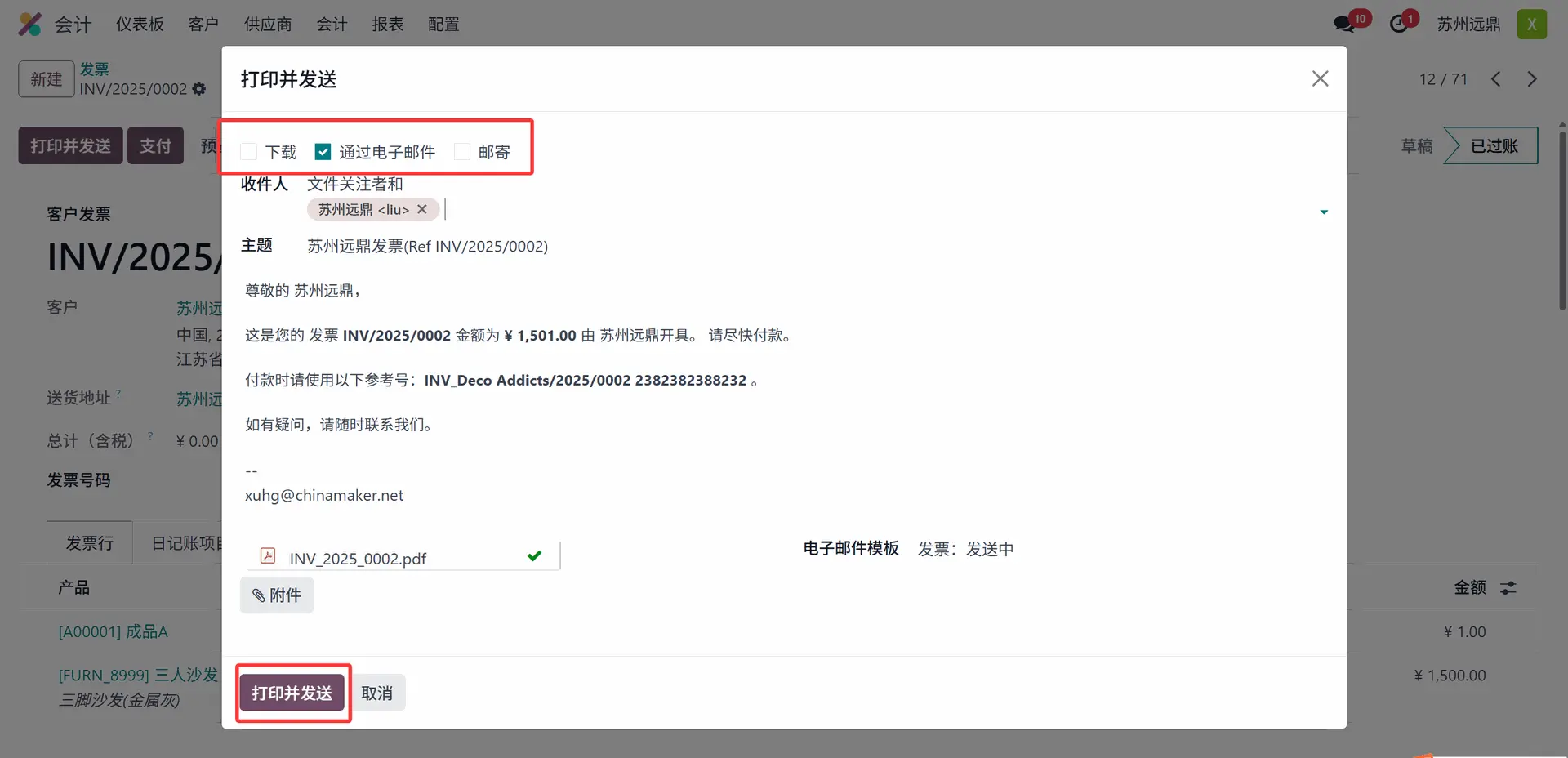 点击“打印和发送”按钮,发票将通过电子邮件发送给客户。一旦发票被确认,会出现“打印和发送”按钮。点击“打印和发送”按钮将弹出一个窗口,然后点击“打印和发送”按钮。如果“下载”和“邮寄”选项附近的布尔值被启用,此文档将被下载并通过邮寄发送给客户。