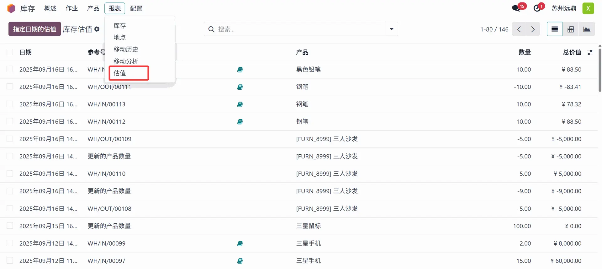 随后,发货中每个产品的价值及其数量和估值会显示在“库存估值”(Stock Valuation) 仪表板上。例如,如果在上述采购订单中以单价10人民币购买了10支笔,减去税项后,仪表板的“总值”(Value) 列将显示计算出的88.5人民币估值。