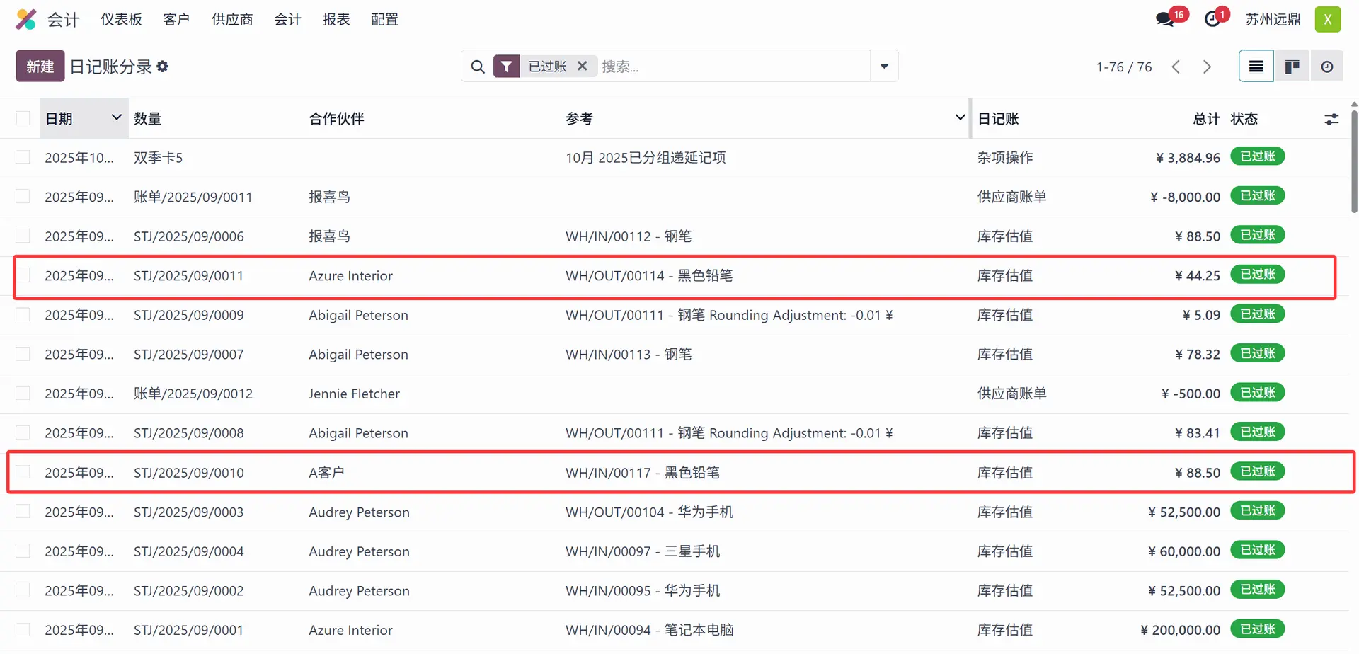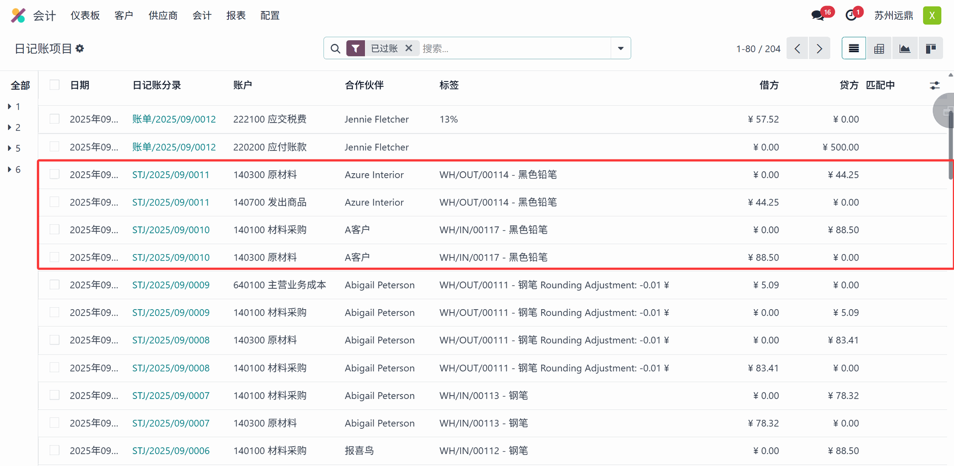 Odoo 会计软件也存储与自动库存价值相关的数据。请分别在“日记账”(Journal) 和“编号”(Number) 列中查找前缀为 STJ 的库存价值条目。