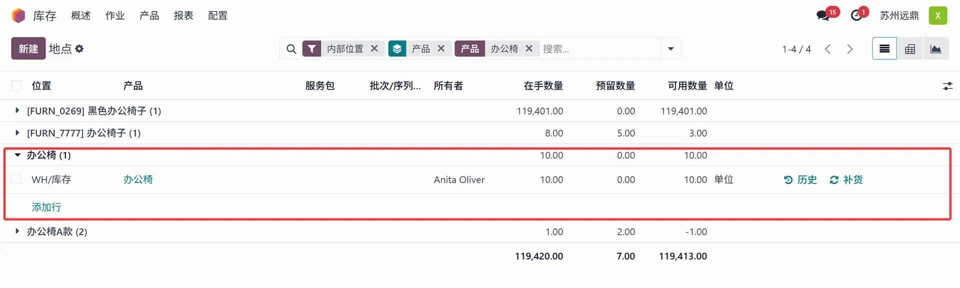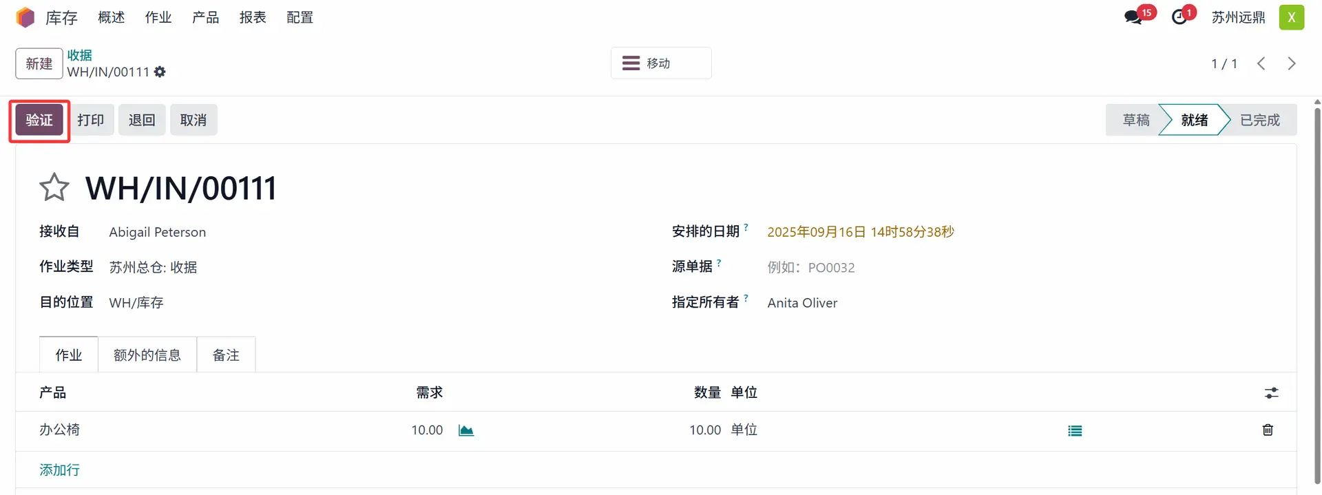 如上图所示,从供应商 Abigail Peterson 收到的产品,分配的所有者是 Anita Oliver。在“操作”选项卡中选择了 10 个数量的 办公椅。点击“标记为待办”按钮。