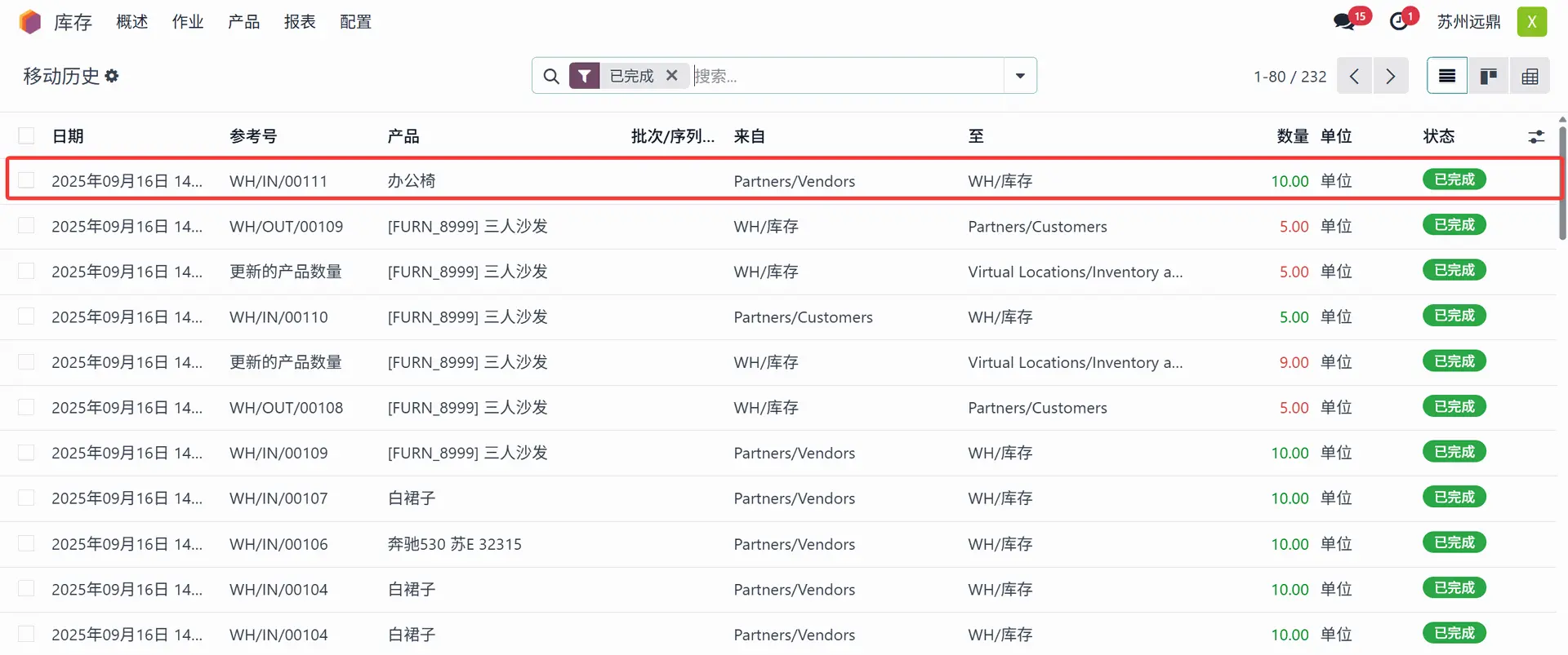 “报表”菜单的“移动历史”部分显示了当前正从某个存储位置移动到另一个库存的产品。让我们检查此项以确认调拨。下面详细列出了产品的日期、参考、产品、批次/序列号、来源、目的地、数量、单位和状态。