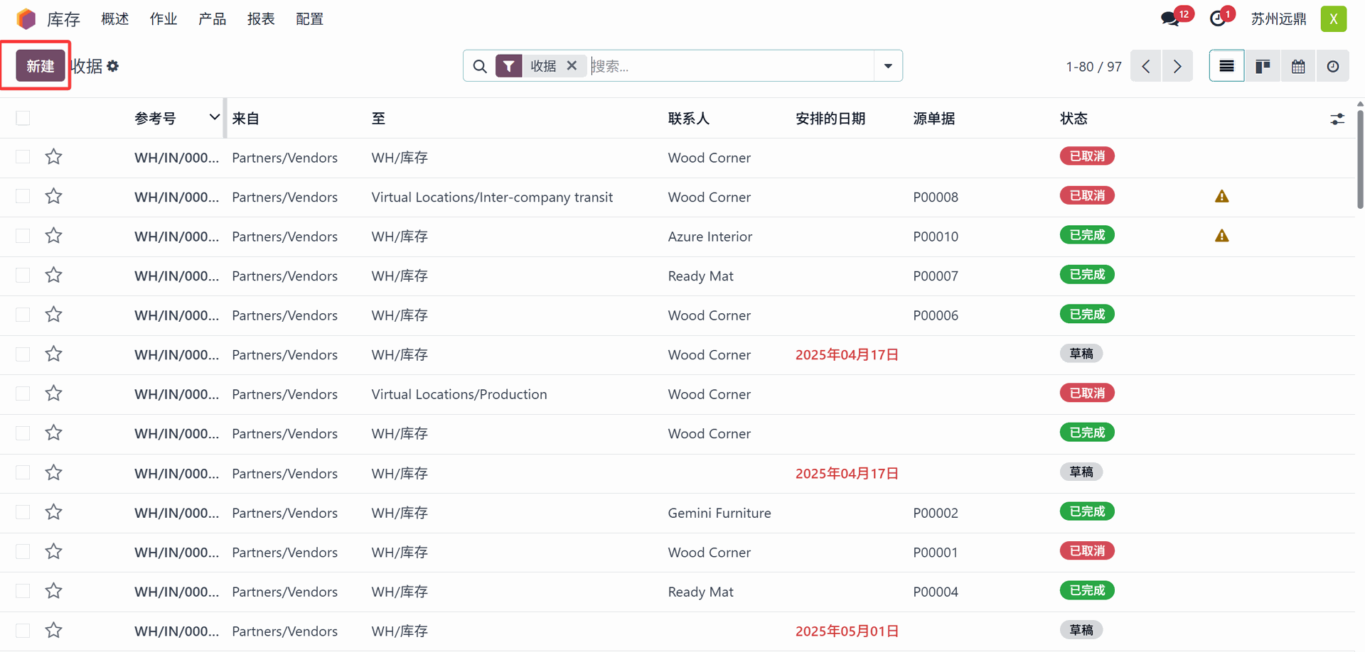 仪表板提供有关收货单的信息,包括参考号、来源、目的地、联系人、计划日期、源文档、批次调拨、公司和状态。点击“新建”按钮创建新的收货单。