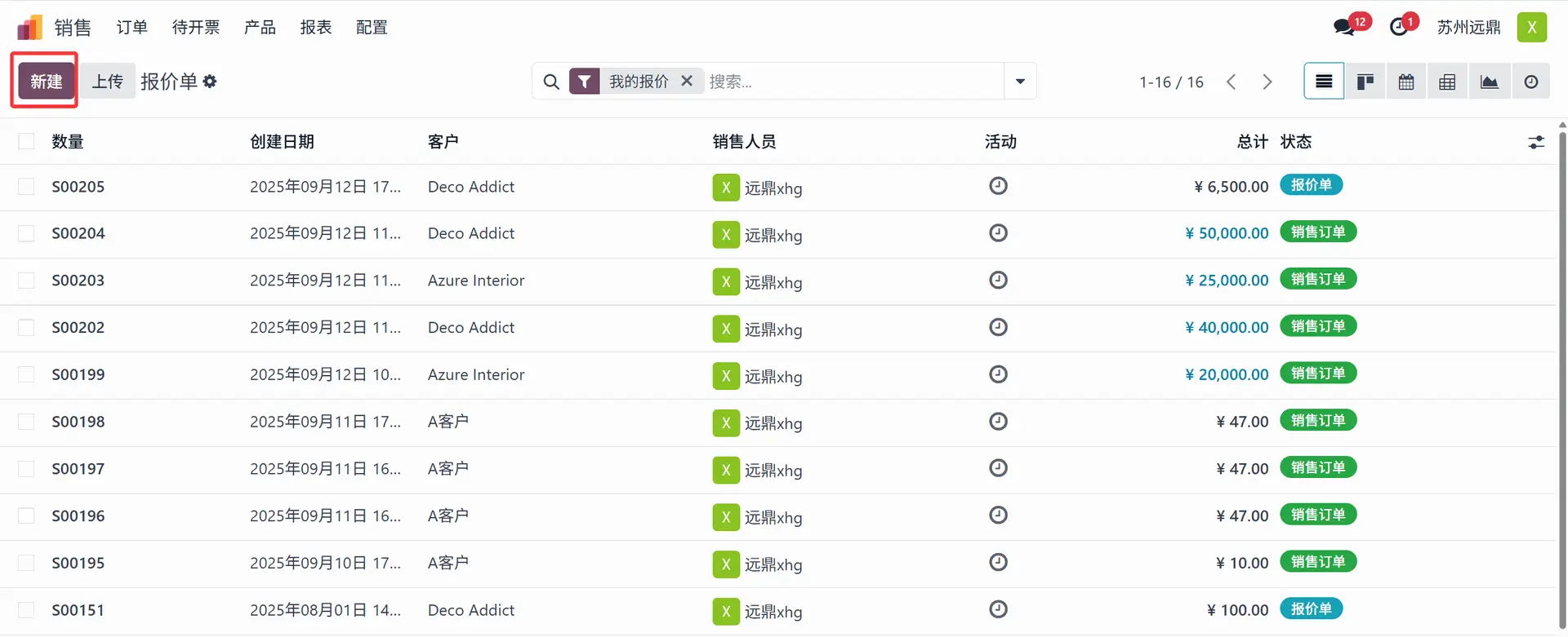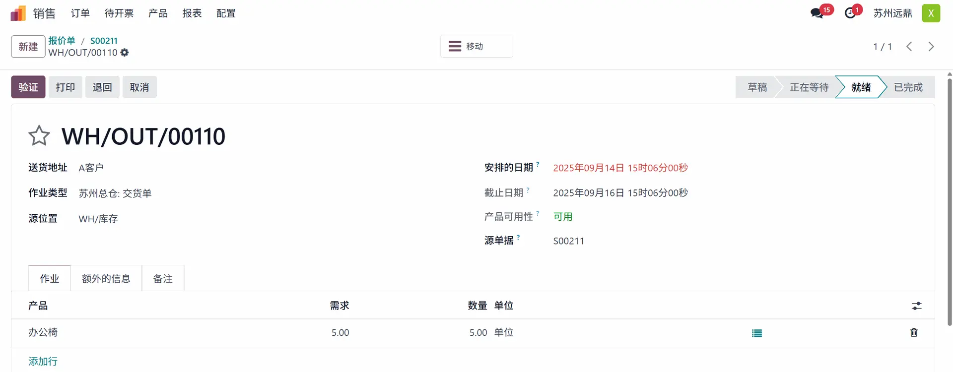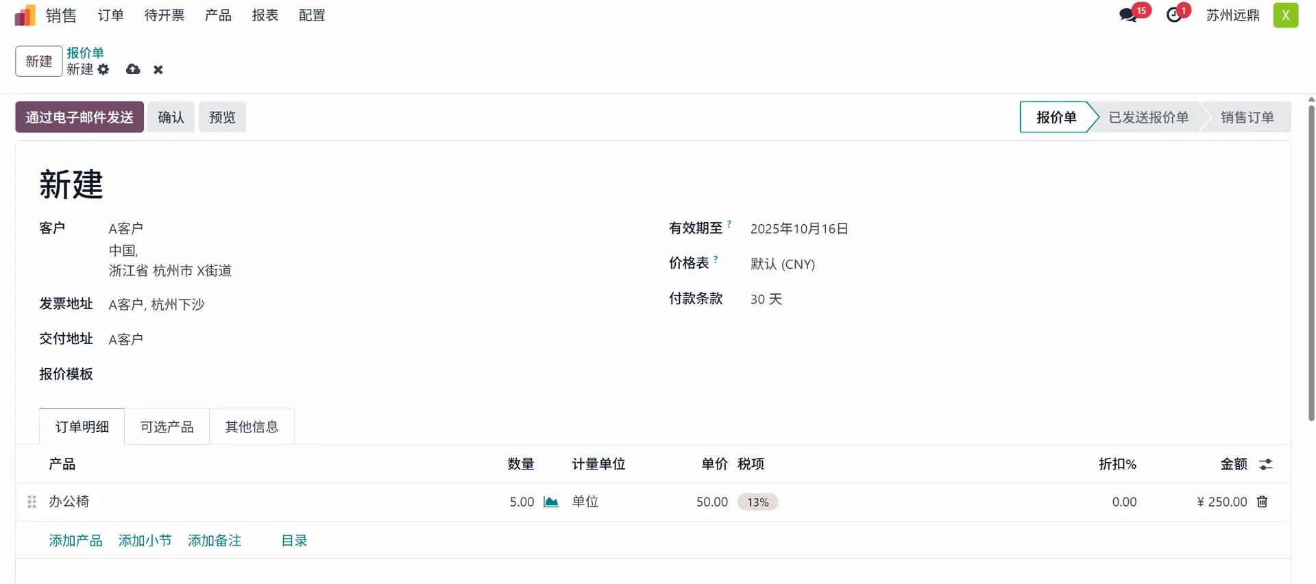 表单填写完毕后确认报价单。选择“交货”智能按钮后,使用“验证”按钮确认报价单。