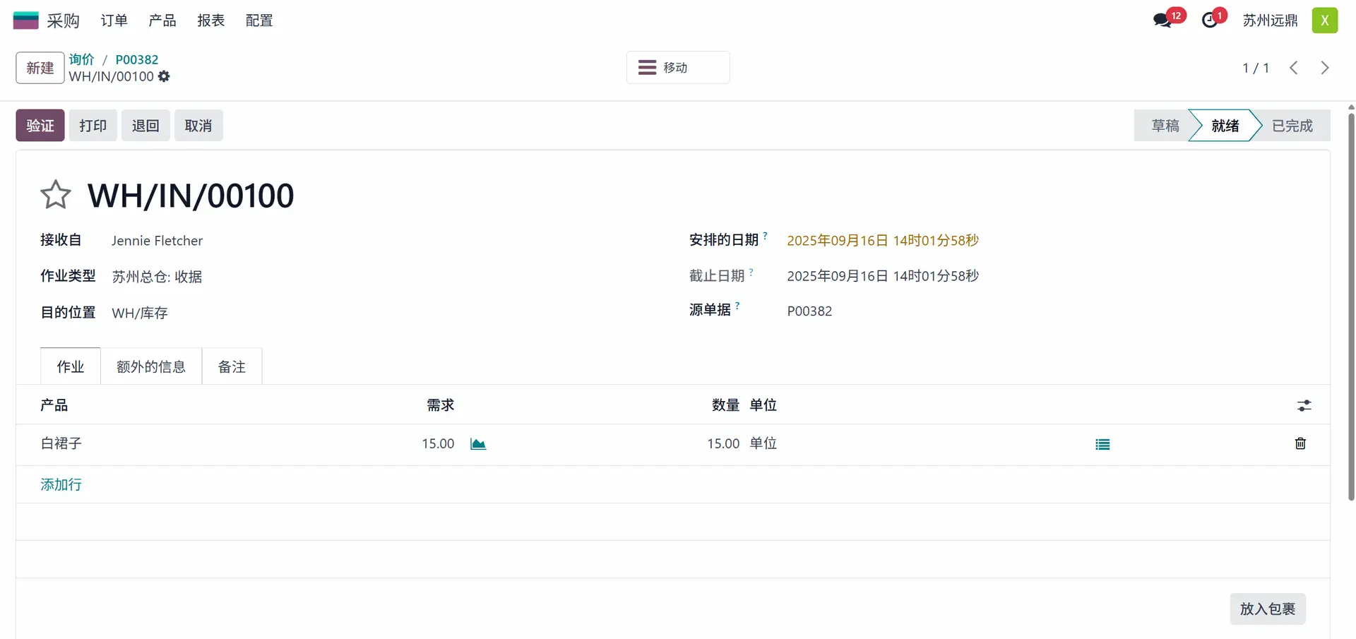 现在,在采购模块中创建一个新的“询价请求”(RFQ)。在订单行中选择新创建的产品,指定所需数量,并确认 RFQ。采购订单一经确认,您就可以继续接收产品并验证要接收的数量。