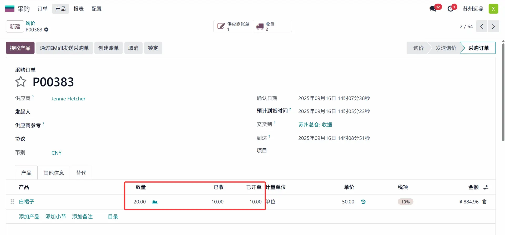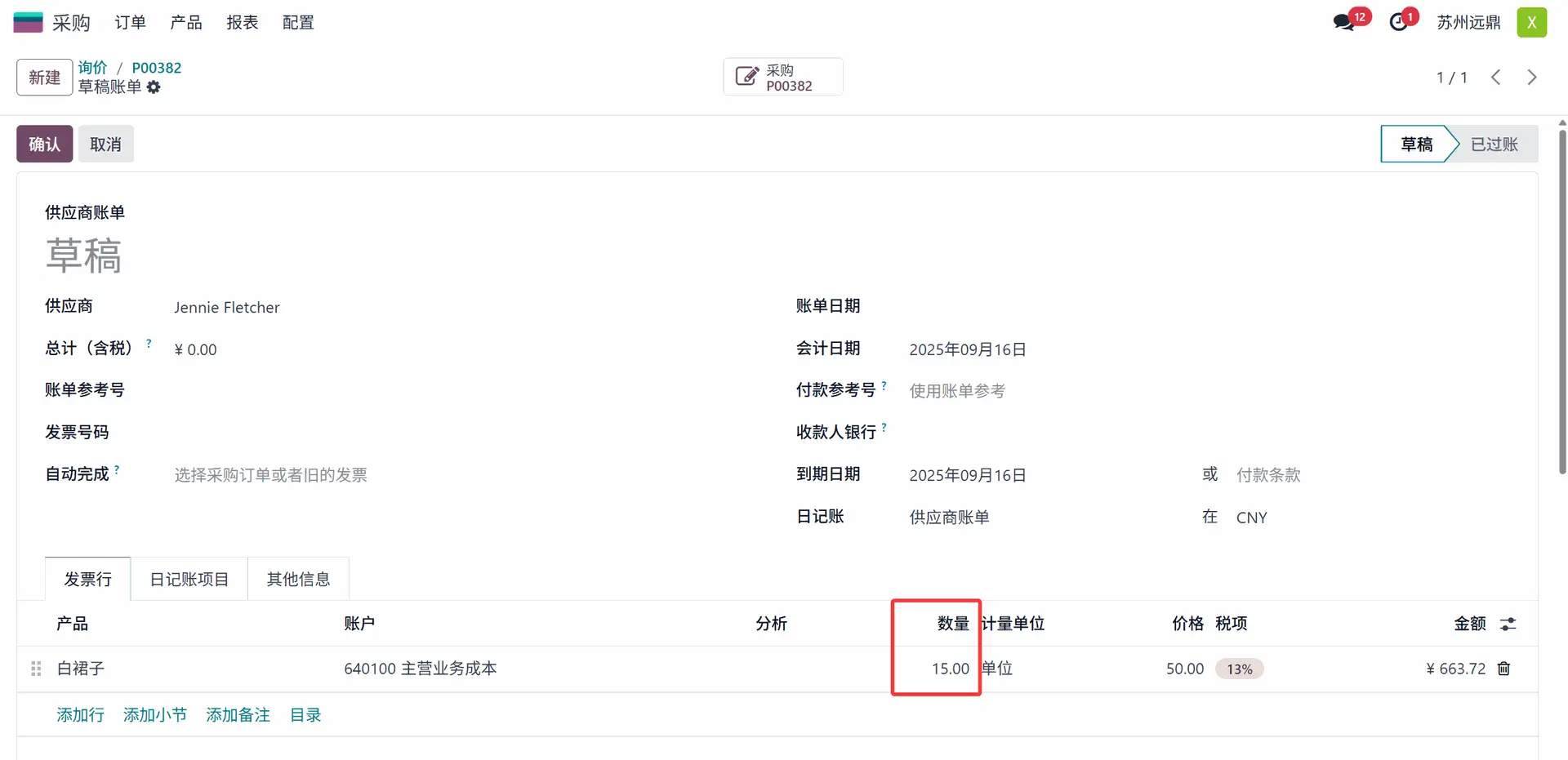 然而,无论收到多少数量,草稿账单中仍将显示订购数量。