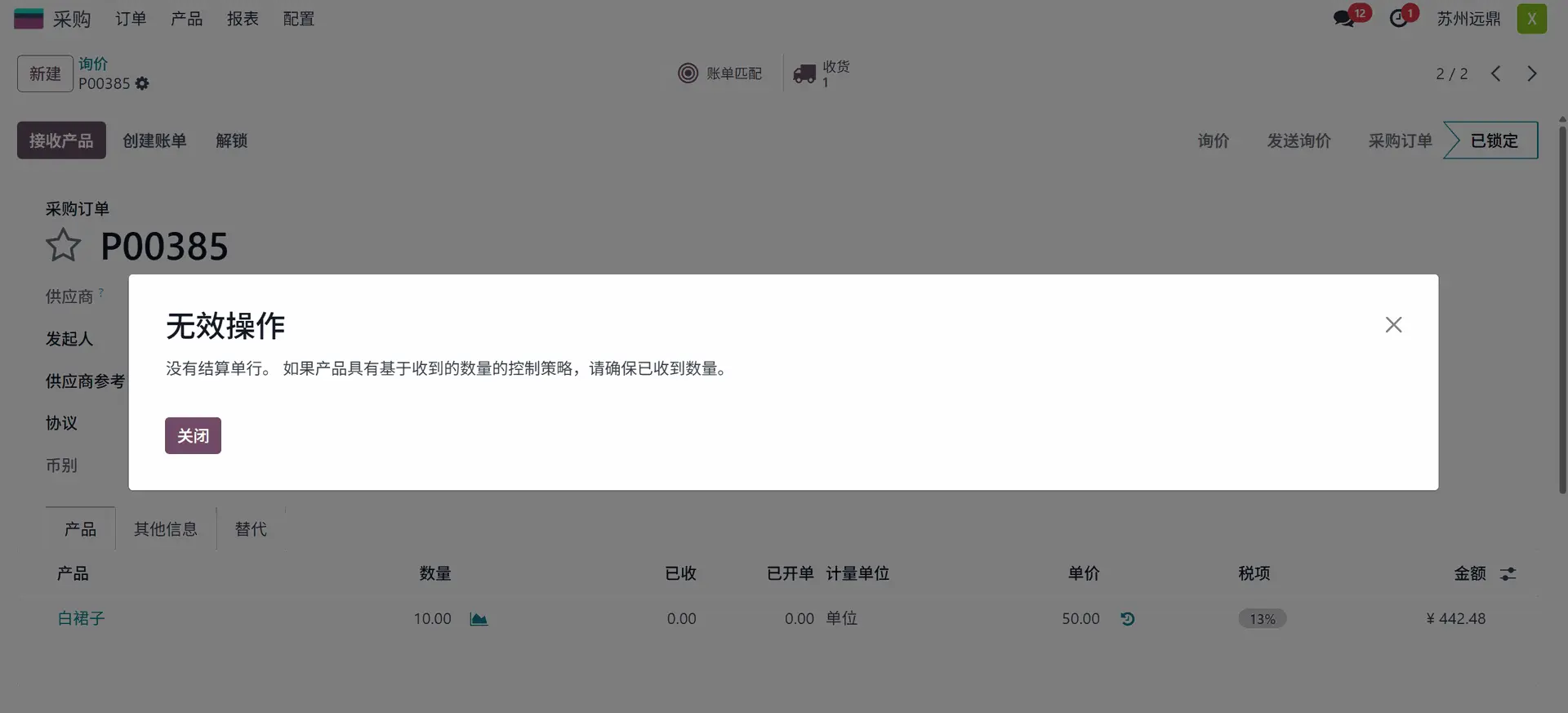 当您为“收货数量”策略创建新的 RFQ 并确认 RFQ 时,务必确保在尝试生成账单之前产品已收到。如果您尝试在未收到产品的情况下创建账单,系统将显示错误消息:“没有结算单行”(“There is no invoiceable line.”)。此错误表明开票流程无法继续,因为没有产品被标记为已收到以作为开票依据。