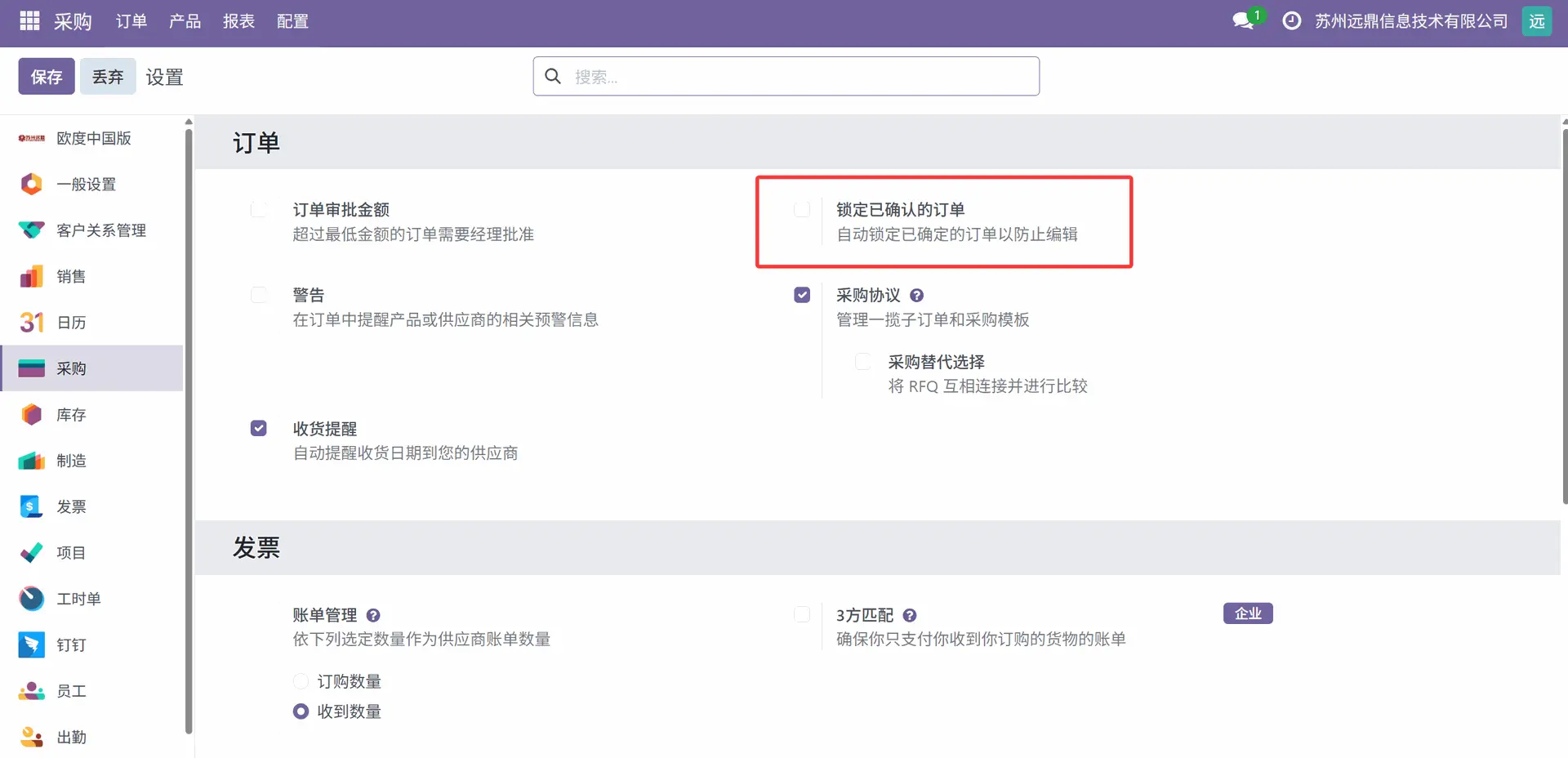 要激活此功能,请转到采购模块的 配置 > 设置。在“订单”部分,有一个“锁定已确认订单”的选项。