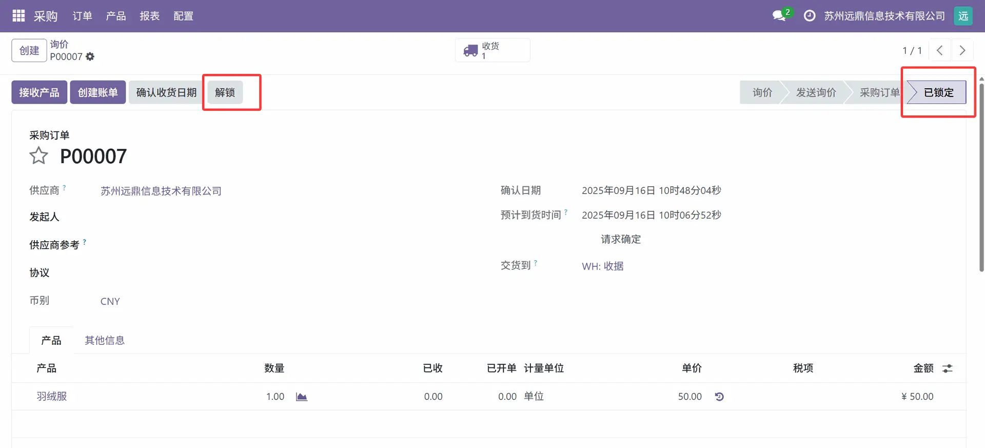 一旦点击“解锁”按钮,订单将被解锁,并从“已锁定”状态移回“采购订单”状态。编辑后,如果客户希望再次将采购订单置于锁定状态,用户可以手动点击采购订单顶部的“锁定”按钮来实现,如上图所示。