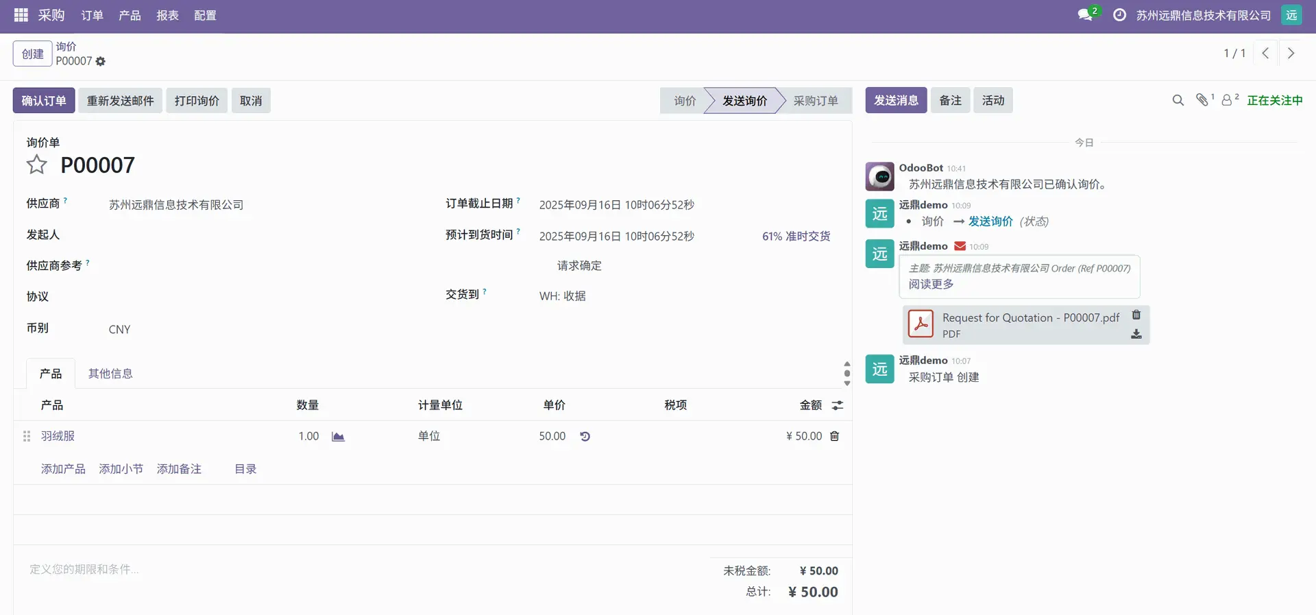 在询价请求中,有“预计到货日期”,并且“确认日期”是自动添加的。预计到货日期是订购产品预计从供应商处交付或收到的预期日期。确认日期是指采购订单被用户正式确认的日期。点击询价请求中的“确认订单”按钮,用户可以确认采购订单。通常,当点击“确认订单”按钮时,询价请求将从“发送询价”状态变为“采购订单”状态。