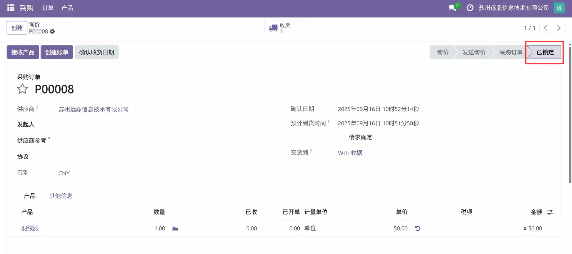 一旦订单被确认,将会出现“账单匹配”和“收货”智能选项卡。账单匹配选项用于核对或将供应商账单与相应的采购订单进行匹配。