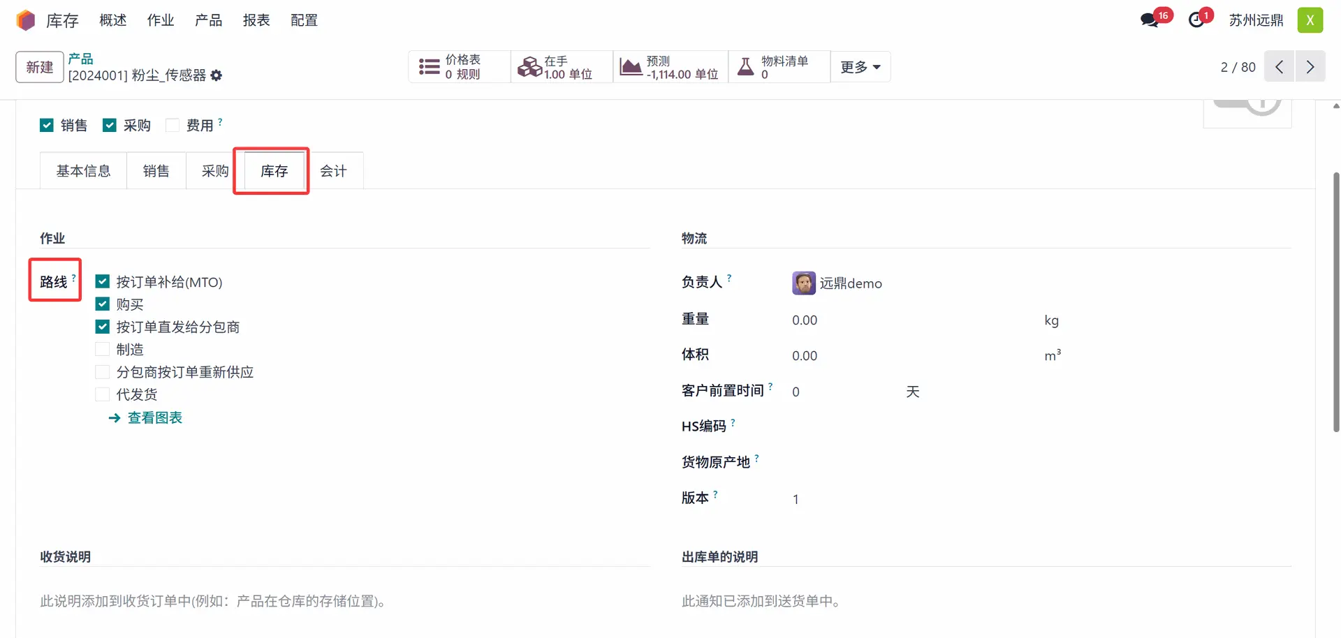 在数据库中设置每个产品时,您可以在 Odoo 中为其指定特定的操作路线。如下所示,产品管理窗口的“库存”(Inventory) 选项卡有一个特定字段,用于为产品的库存移动选择最佳路线。