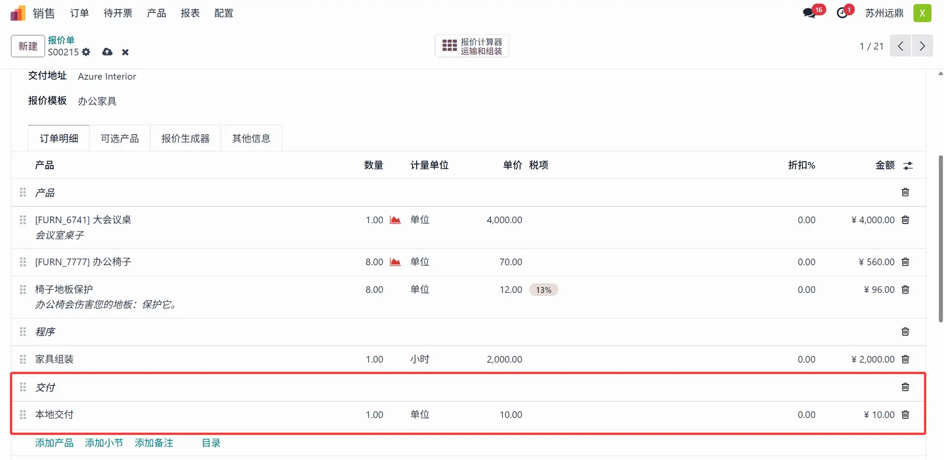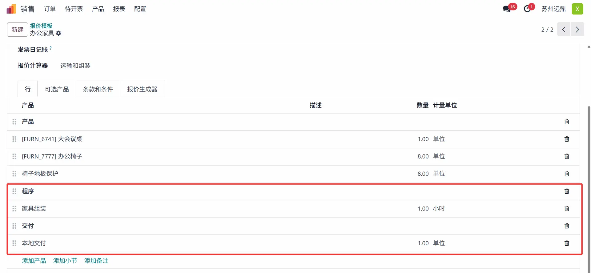 “行”选项卡包含用户需要包含在报价中的产品列表。这里的报价模板是为用作办公家具的产品创建的。行内部包含三个部分:产品、程序和交付。