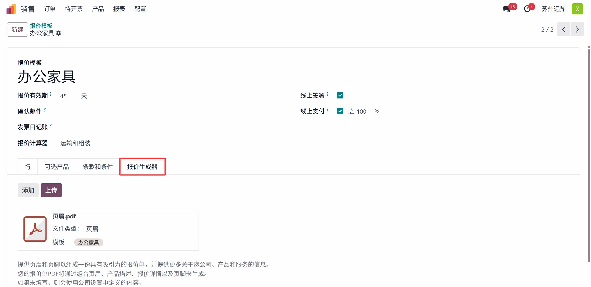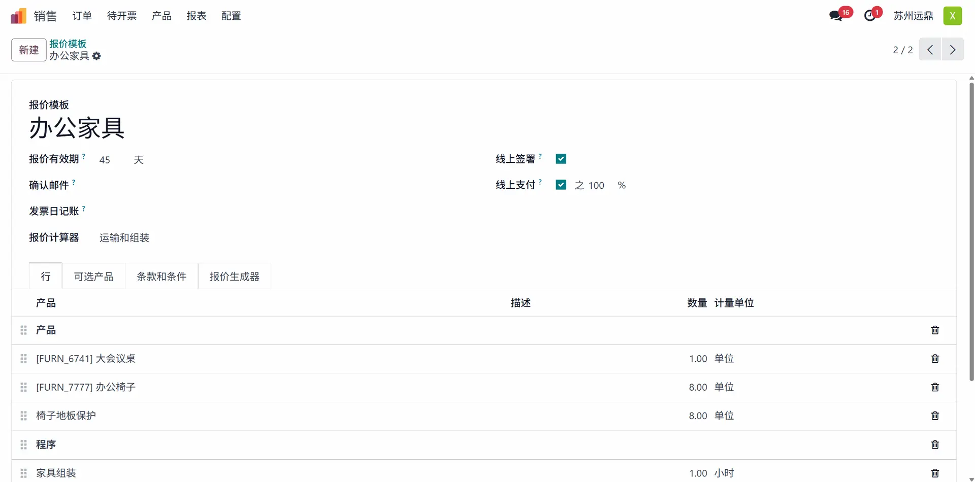 报价模板需要一个名称来标识。新建一个模板命名为“办公家具”。在名称之后,用户应添加报价有效期、确认邮件、公司、发票日记账、报价计算器、在线签名和在线支付。