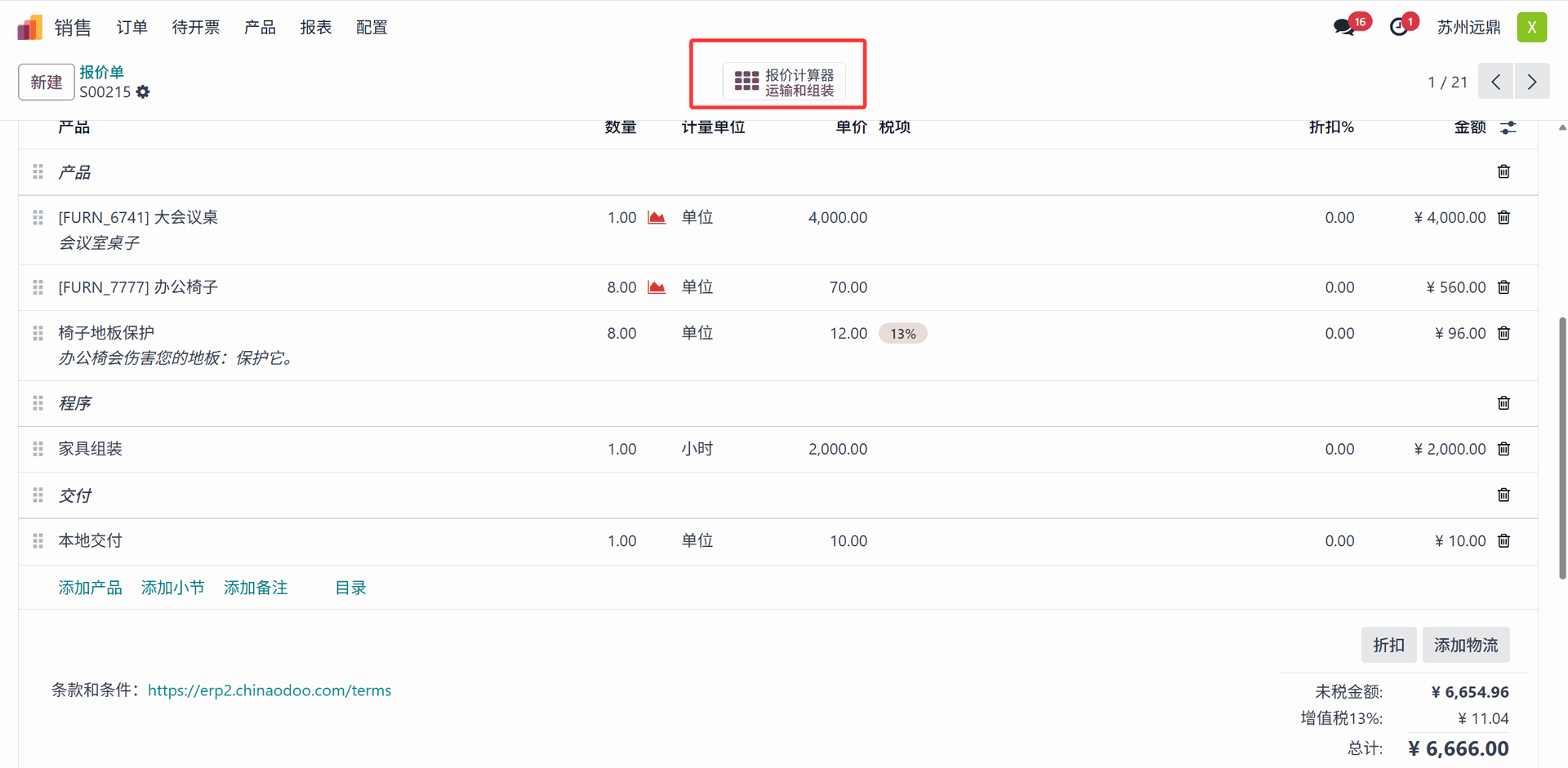 目前,交付费用是10人民币。交付费用会根据(计算器中的)值自动变化。报价显示了一个名为“报价计算器”的新智能选项卡。