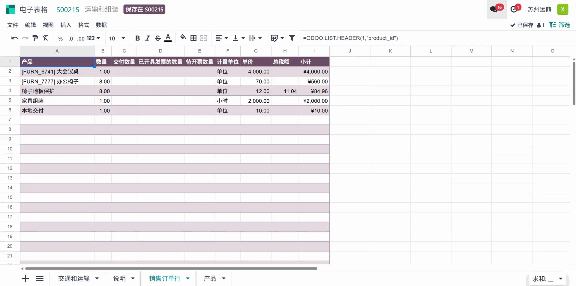 最后一张工作表名为“销售订单行”。包含已创建报价的订单行中添加的产品详细信息。如前所述,数量、计量单位、单价、税费总额、小计、新的组装和运输小计以及所需的卡车等详细信息为每个产品单独列出。
