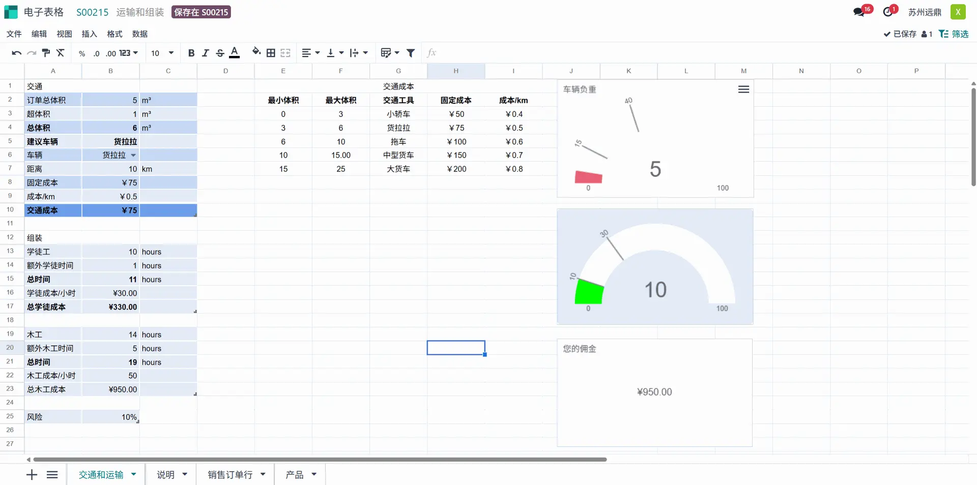 让我们先更改配置。用户在此处添加了一些“额外体积”。这里的“推荐车辆”是中型货车,但用户选择了轻型卡车进行运输。与此同时,距离也更新为10公里。在组装部分,“额外学徒时间”更新为1.5小时,“额外木匠时间”更新为5小时。