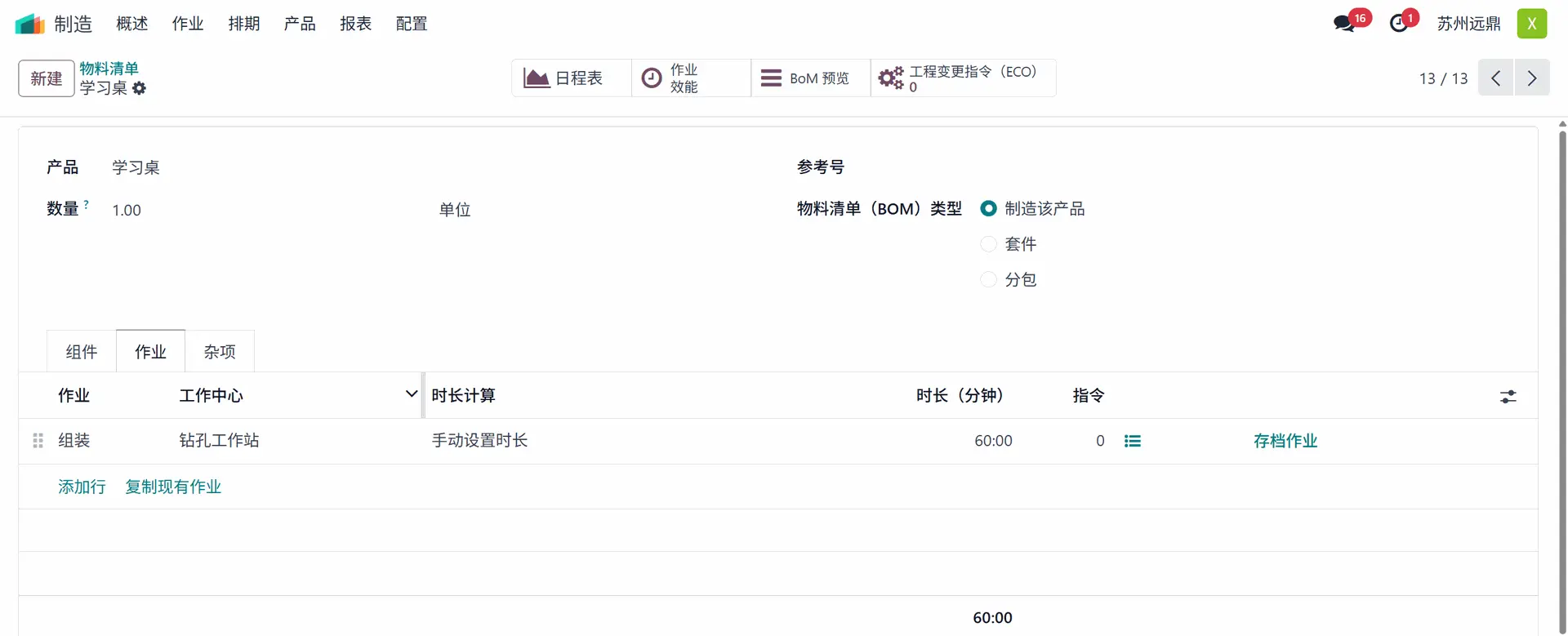 下面的截图显示了一个产品学习桌的物料清单。选择的 BoM 类型是生产此产品。“组件”(Component) 选项卡包含带有数量的原材料列表。