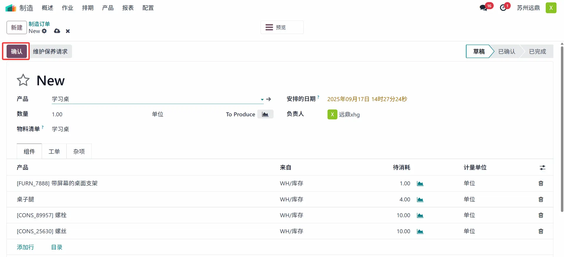 在产品字段中选择相同的产品学习桌。然后选择已创建的物料清单。之后,添加到 BoM 中的所有原材料和工序都会显示在相应区域。