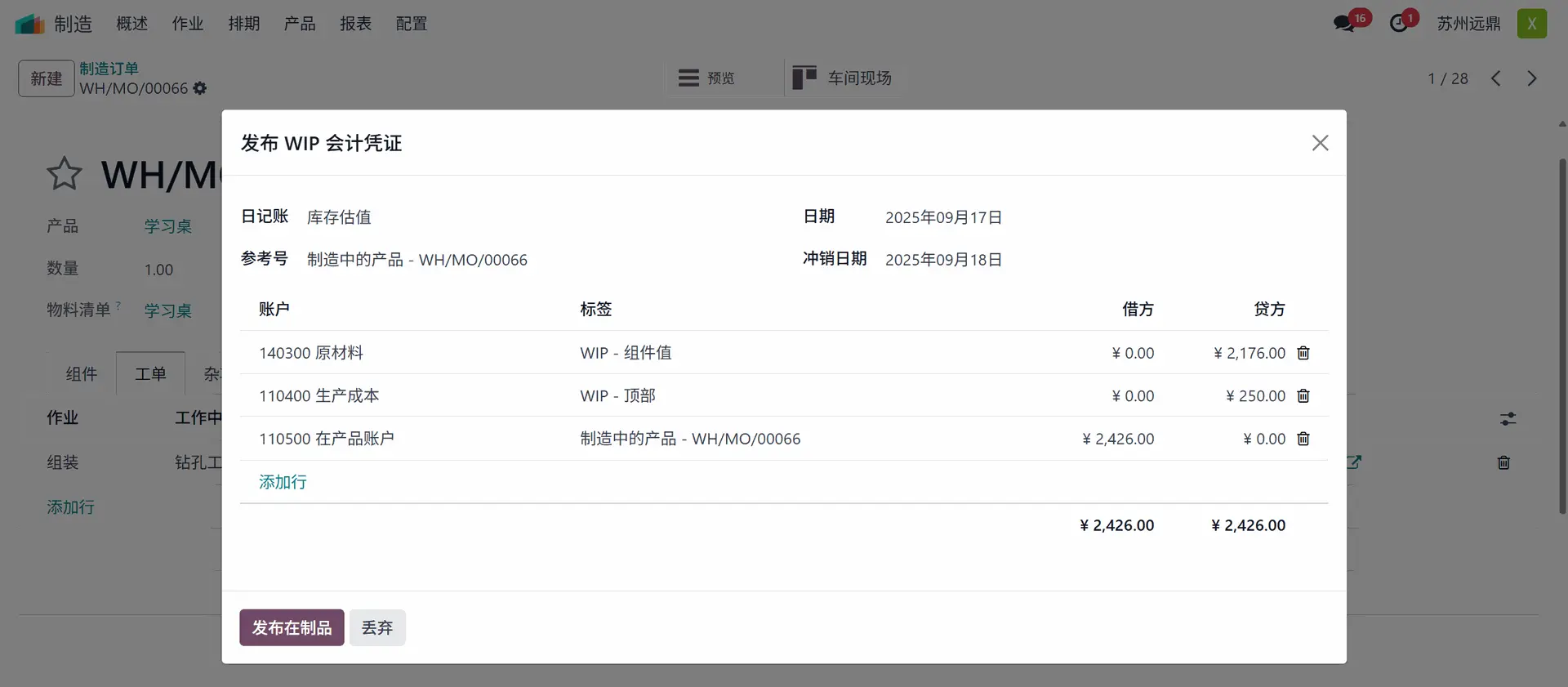 凭证中的最后一个账户是在产品账户 (Work in Progress account)。它计算生产和组件成本的总和,以显示项目的总成本。当资产价值增加时,记为借记(debit)。因此,在产品账户的总价值被借记( deducted 这里指增加资产,所以是借记 WIP 账户)。要將凭证过账到会计中,请点击“过账 WIP”(Post WIP) 按钮。