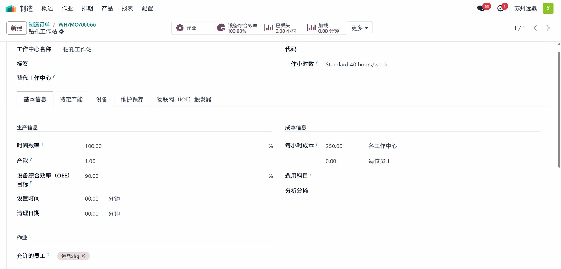 这里,工作中心是 DRILL STATION。此外,检查成本数据可知,每个工作中心每小时成本为 250 人民币。这意味着如果在该工作中心内的产出需要一小时,成本应为 250 人民币。远鼎xhg 也被列为允许的员工 (Allowed Employee)。