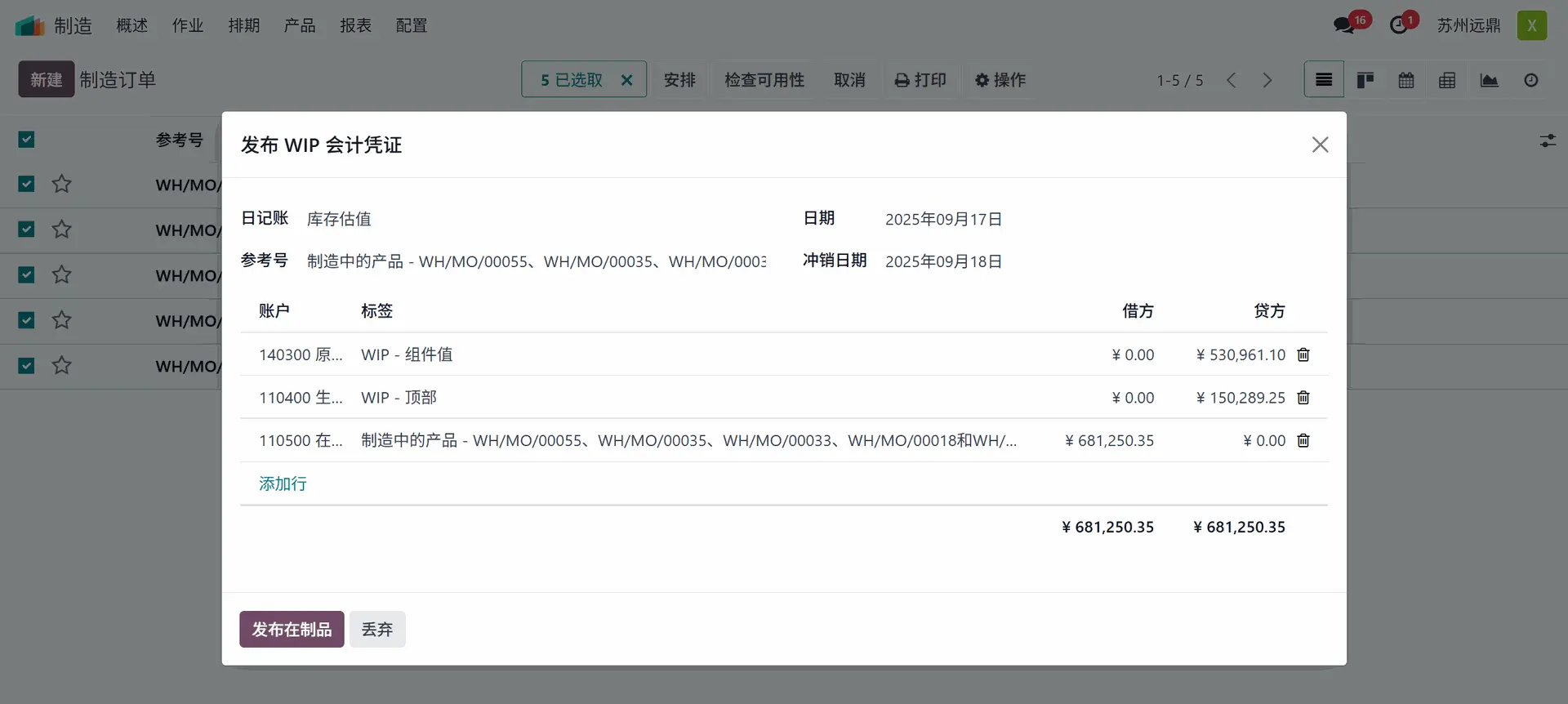 上面的截图显示了凭证条目。显示了原材料账户 、WIP 间接费用账户 和 WIP 账户。用户可以点击“发布在制品”(Post WIP) 按钮来过账凭证。但这里操作尚未完成,所以目前用户放弃了(discard)该凭证。