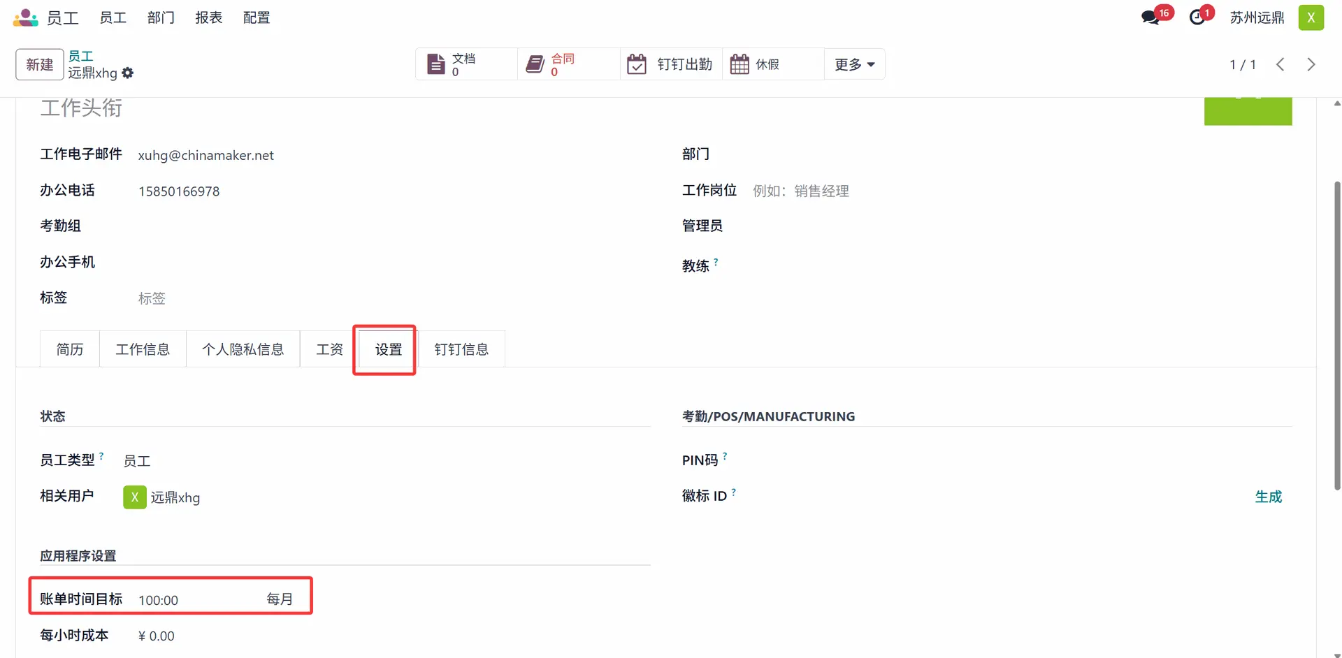 导航到员工模块并打开特定员工 远鼎xhg 以查看员工成本。员工的小时成本显示在 employment 表单的“设置”(Settings) 选项卡上。每小时成本为 100 人民币。