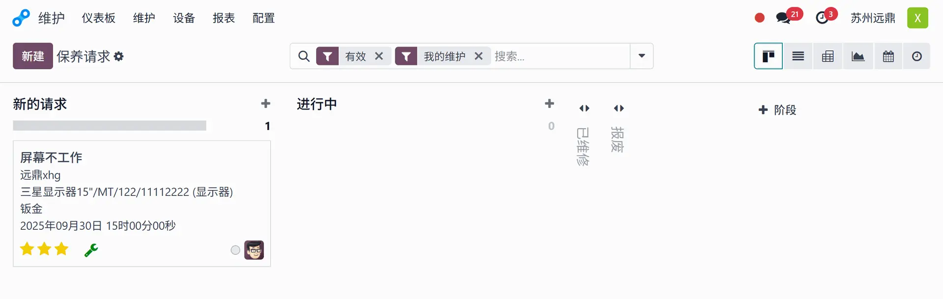 转到维护模块,点击"维护"菜单并选择"保养请求"。从制造订单发起的请求显示在"新建请求"阶段下。