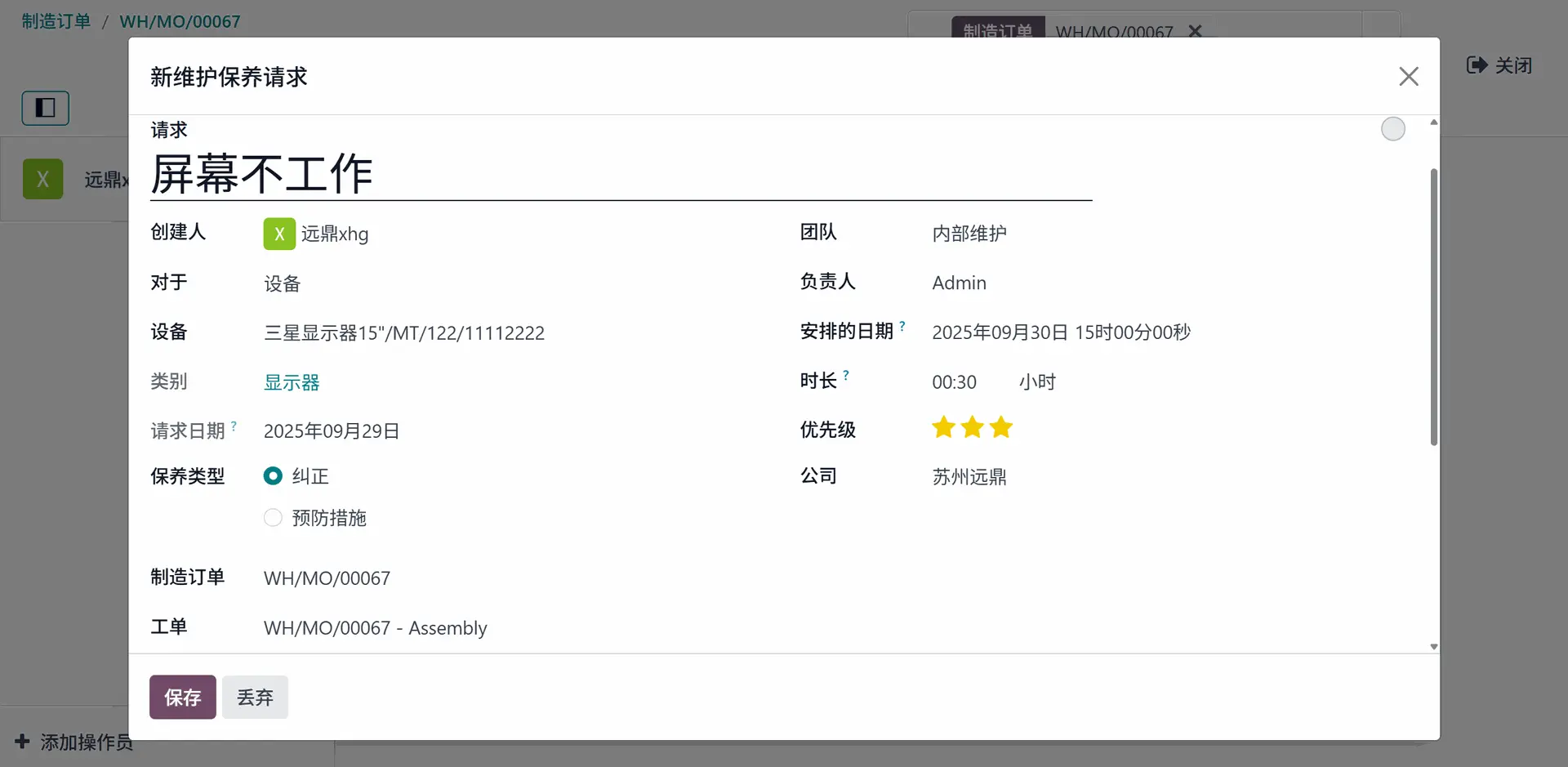 请求描述已添加。这里登录的员工是 远鼎xhg,所以请求由 远鼎xhg 创建。工作中心名称、制造订单和工作订单会自动在请求上更新。用户可以指定团队、负责人、安排的日期、时长、优先级、邮件抄送和公司。