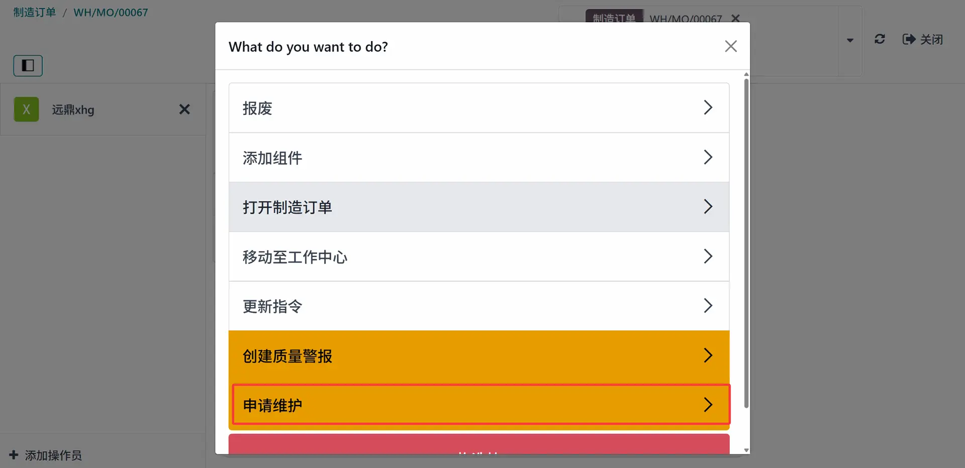 列表显示选项包括:报废、添加组件、打开制造订单、移动到工作中心、更新指令、创建质量警报和申请维护。