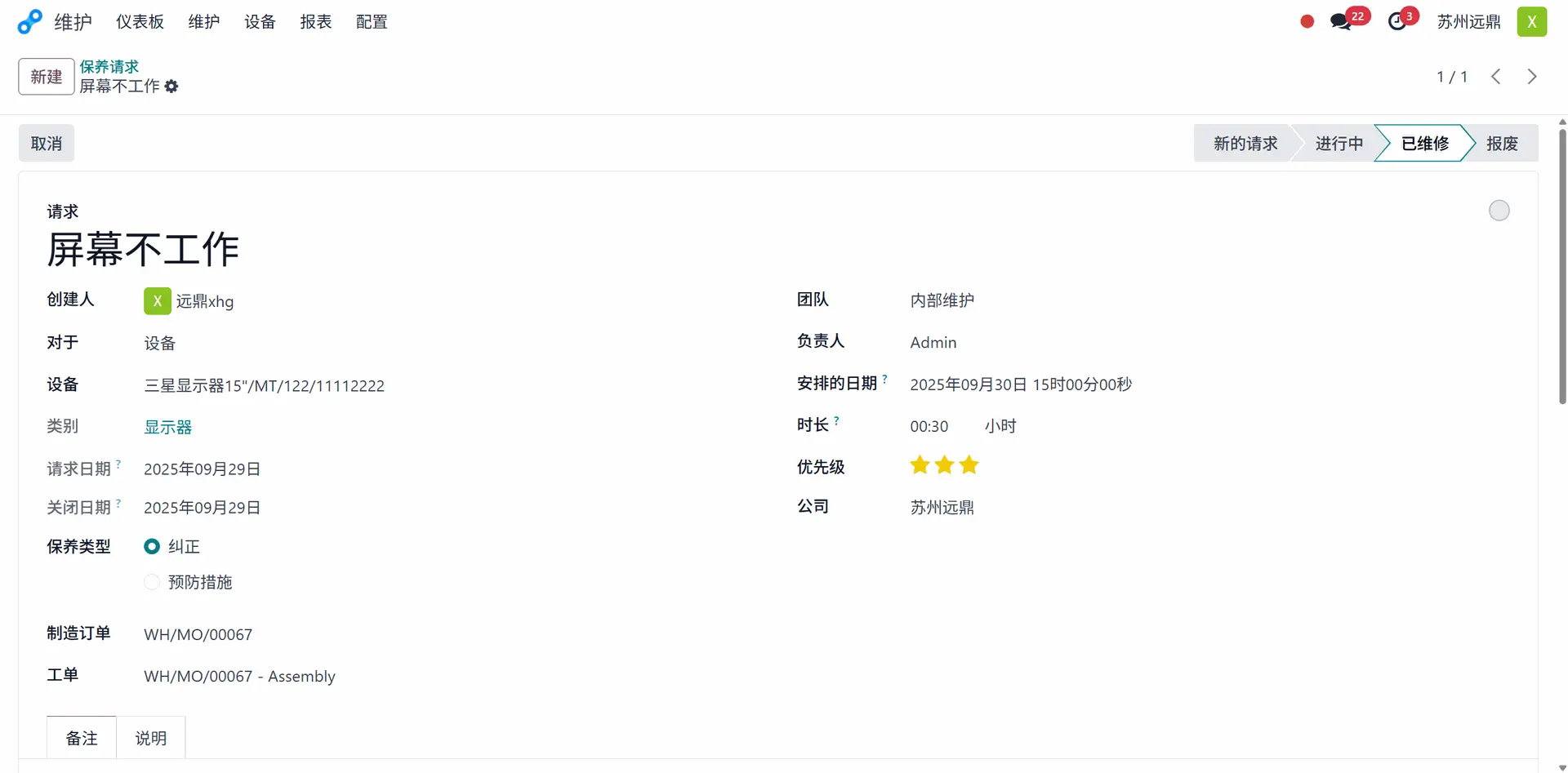 这样,针对生产的维护请求就完成了。用户可以完成生产操作。之后,打开工作中心检查维护详情。在工作中心,有一个名为"维护保养"的选项卡。在维护选项卡内,显示了有关工作中心维护的所有详细信息。