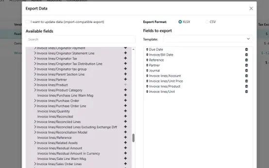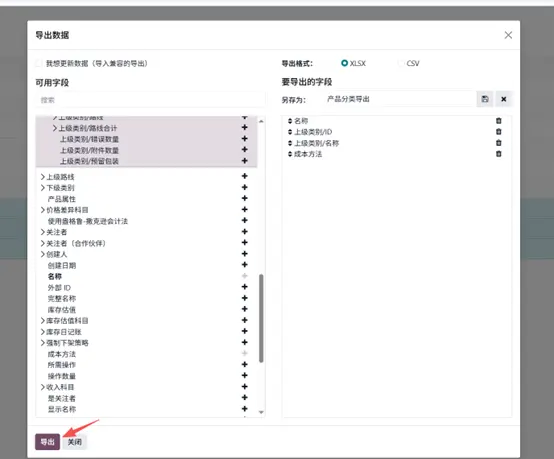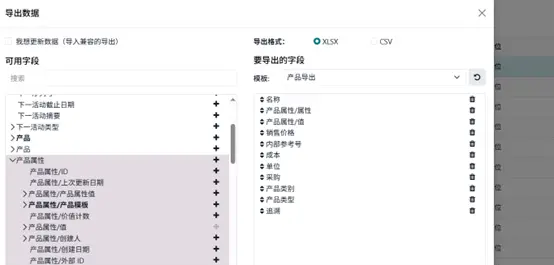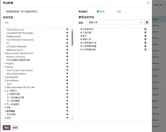 - 选择导出,在弹出窗口中,将左侧可用字段添加到右侧待导出字段。