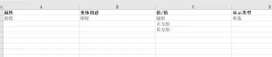 - 在 Excel 中新增属性、设置显示类型、变体创建方式及属性值(如圆形、方形)。