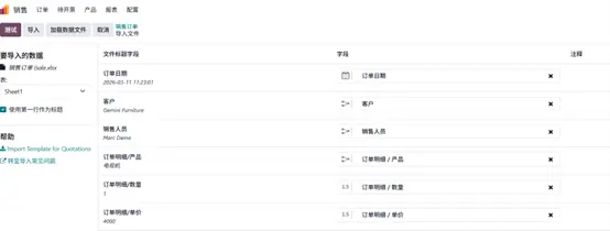 - 回到销售订单列表 → 操作 → 导入记录,上传文件。