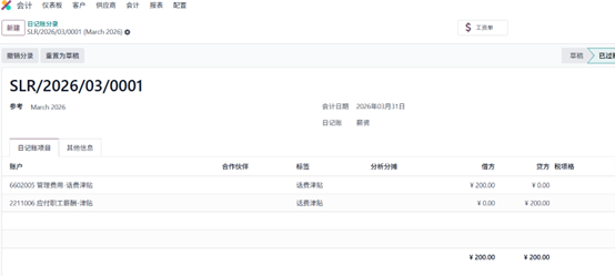 现在你可以查看已生成的会计凭证,其中包含交通补贴对应的借贷科目及金额。凭证过账后,相关科目将同步更新,并在会计账簿中反映该笔薪资交易。