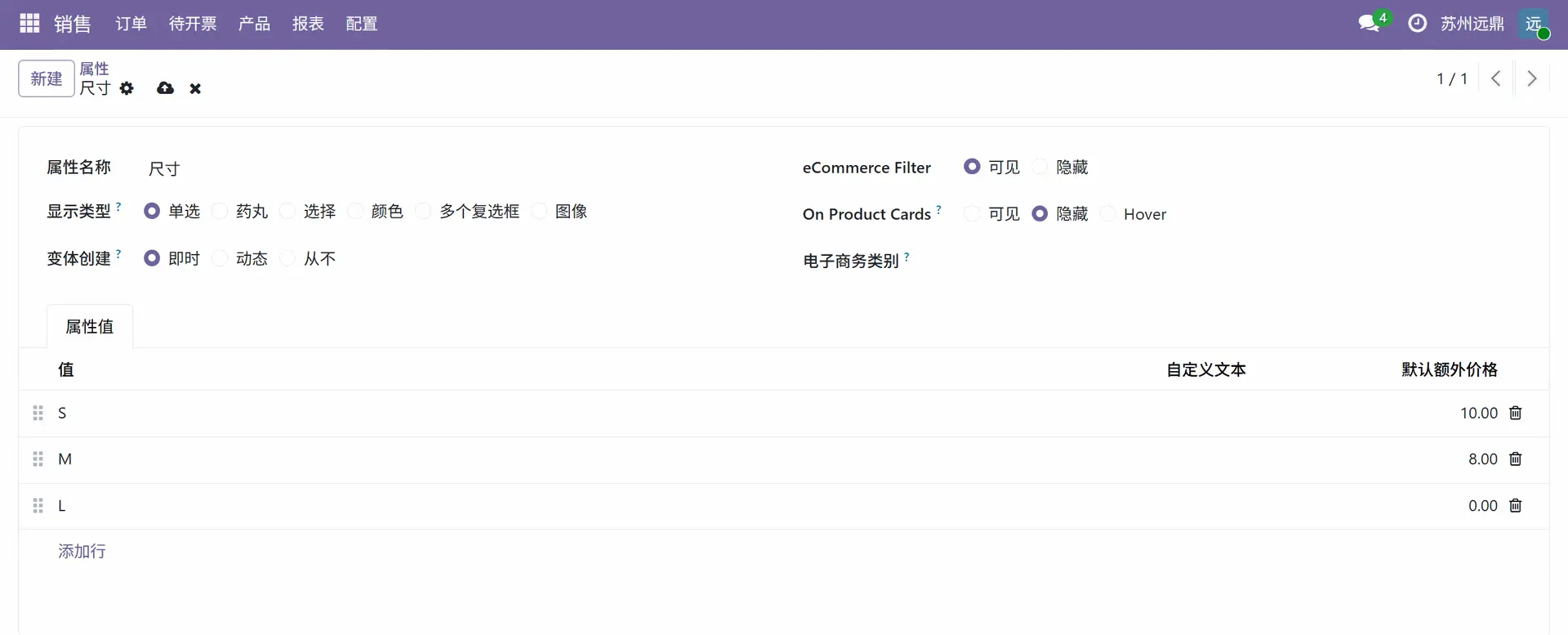 • 显示类型 (Display Type) : 定义该属性在系统中的展示样式,例如在销售模块创建销售订单时、在网站端展示时的呈现形式。