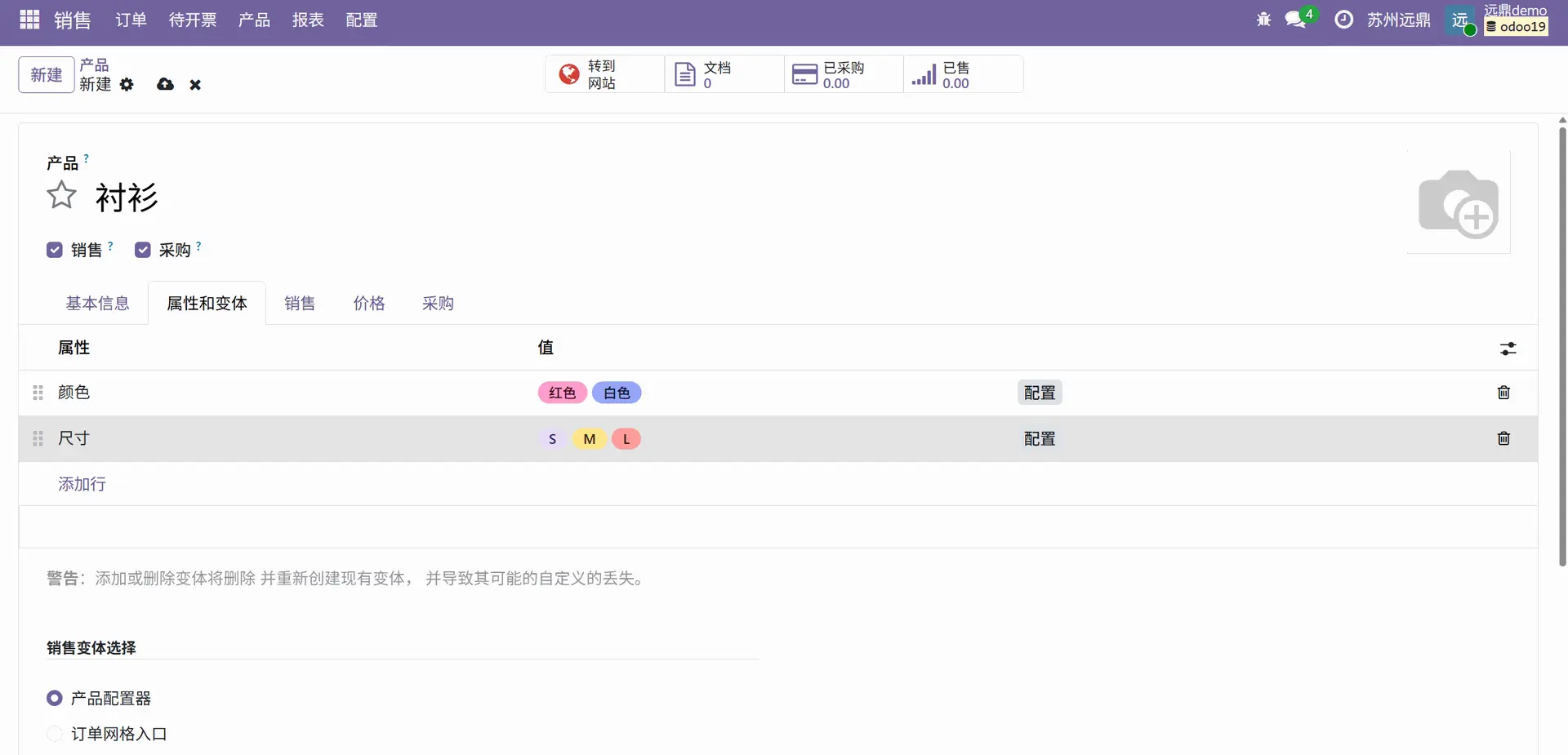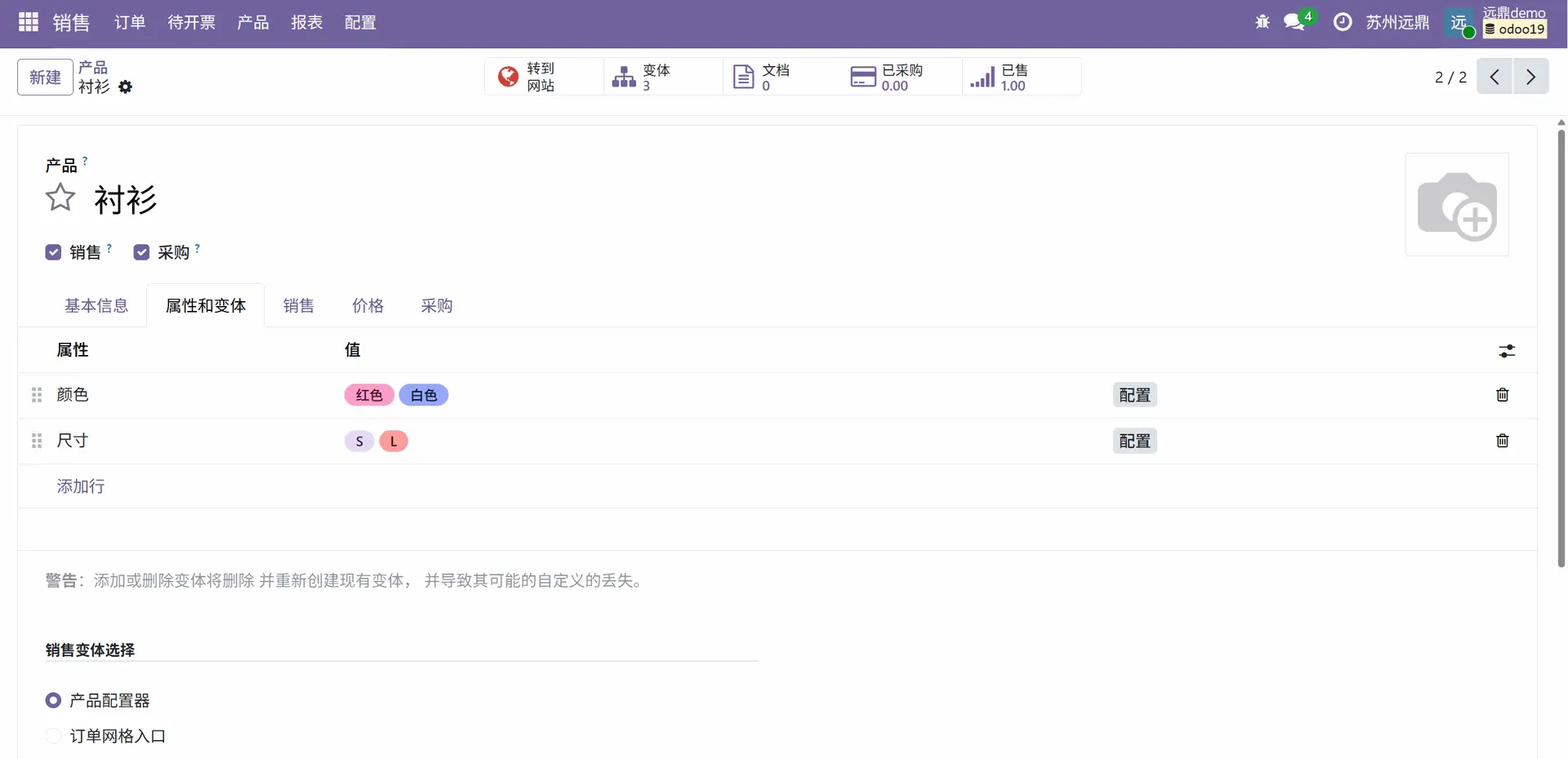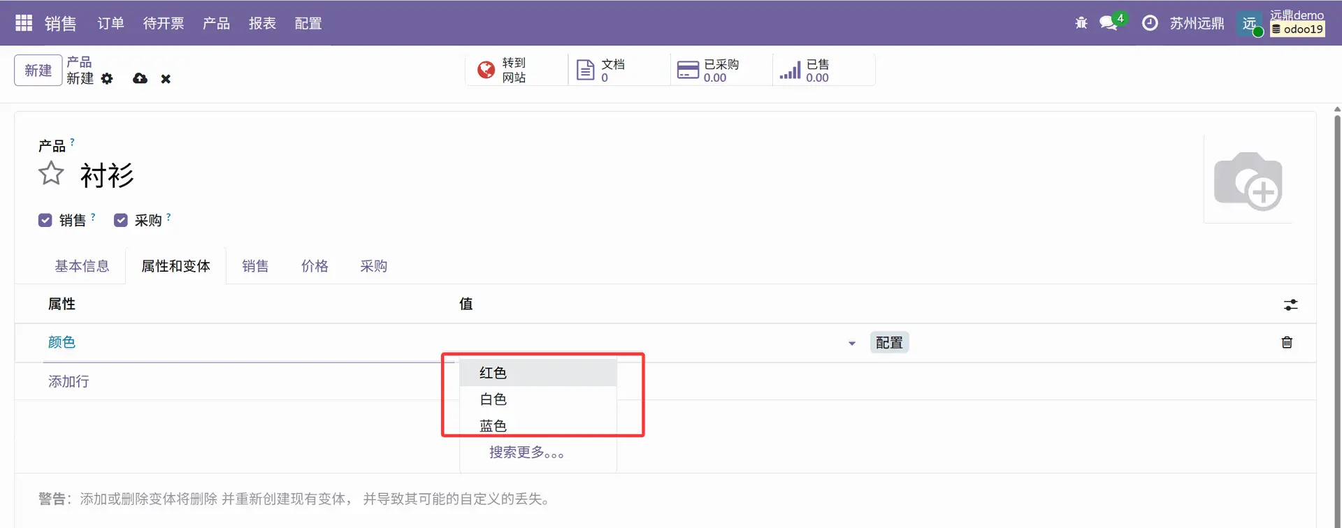 产品变体(Variant) 则是由一组特定属性值组合而成的产品具体配置。代表某一 “属性值集合对应的产品实例”。例如,“红色、中号、棉质的衬衫”,就是 “衬衫” 这款产品的一个变体。在 Odoo 19 中,用户可先创建产品属性,再基于属性配置出不同的产品变体。