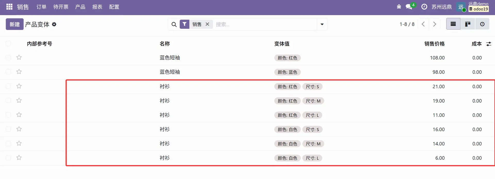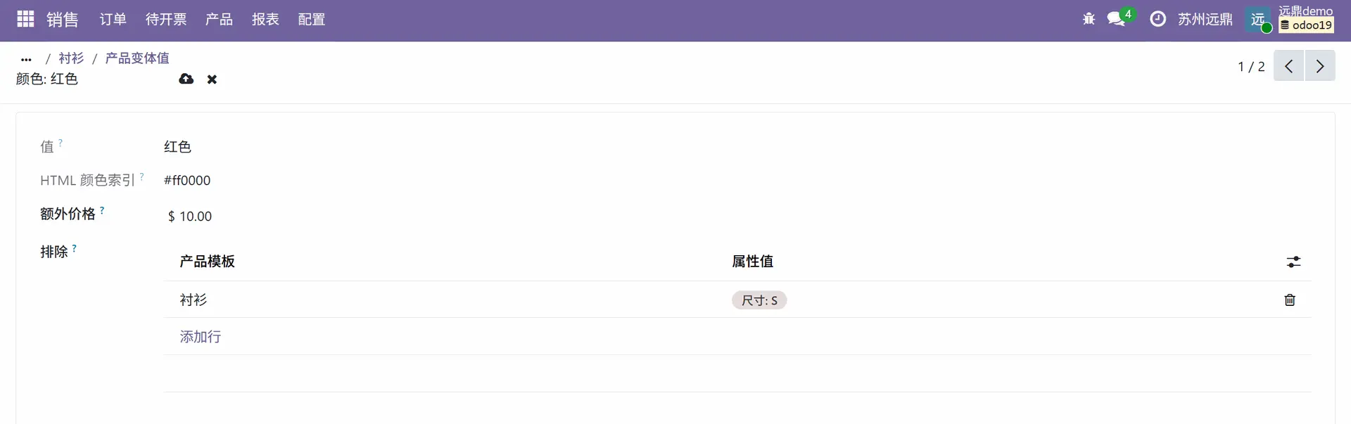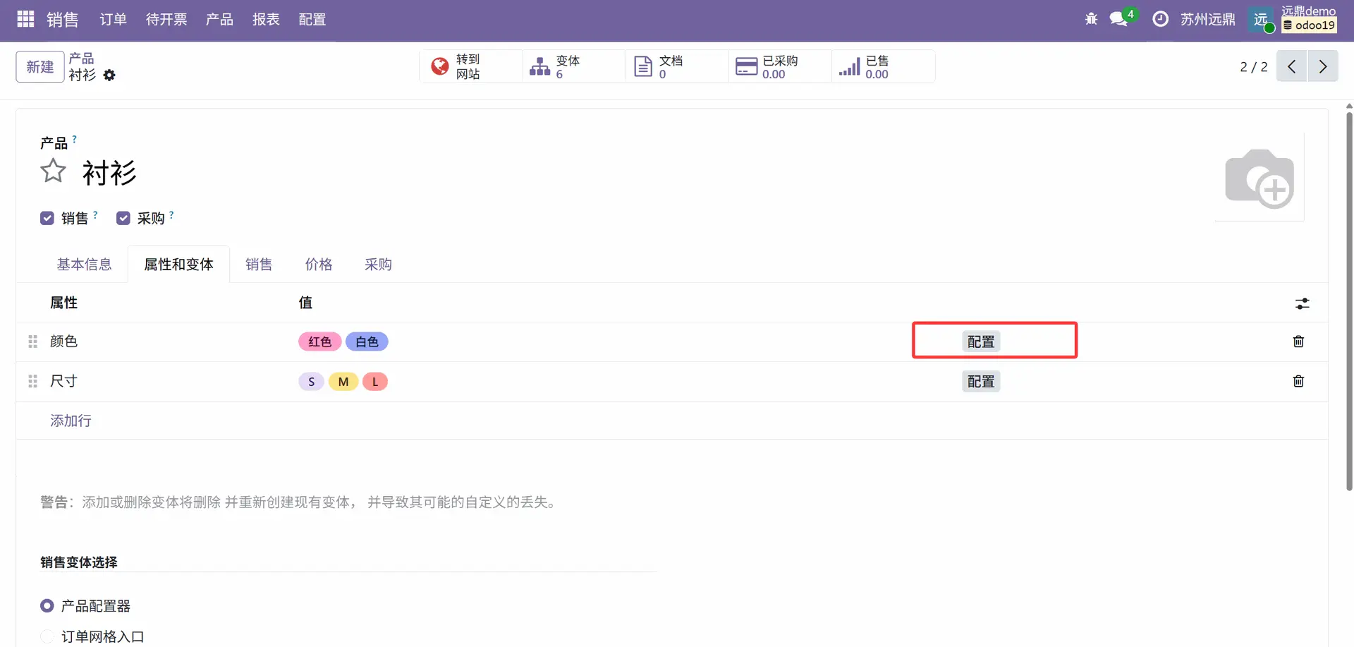 产品变体(Variant) 则是由一组特定属性值组合而成的产品具体配置。代表某一 “属性值集合对应的产品实例”。例如,“红色、中号、棉质的衬衫”,就是 “衬衫” 这款产品的一个变体。在 Odoo 19 中,用户可先创建产品属性,再基于属性配置出不同的产品变体。