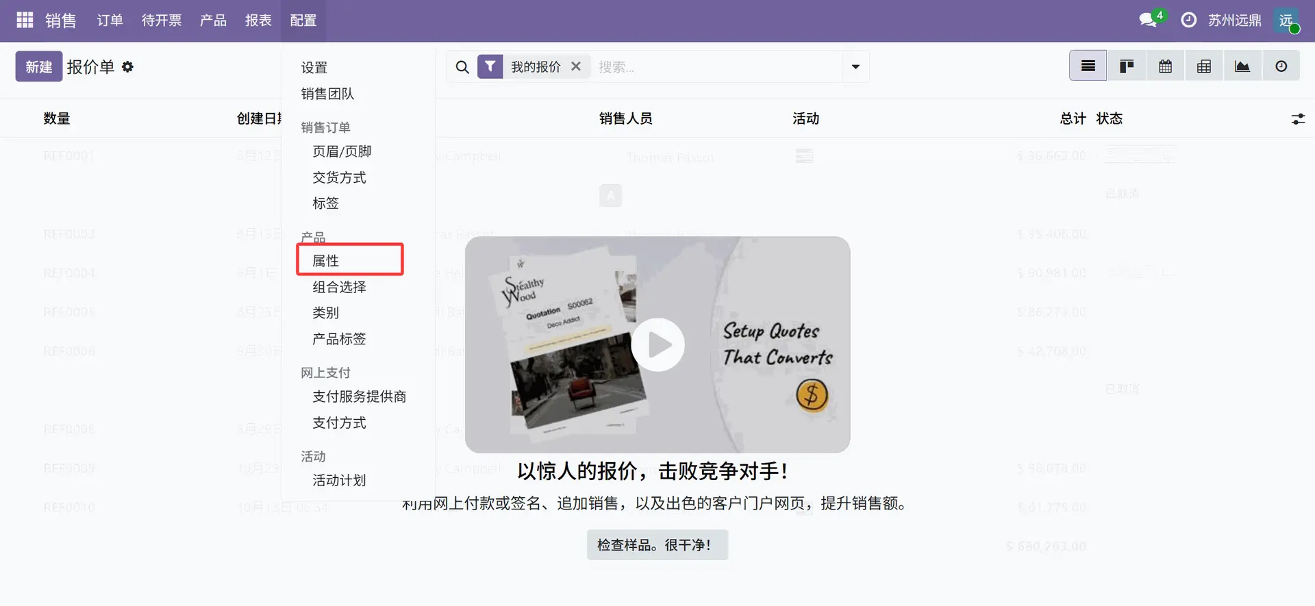 进入「销售(Sales)」应用,在顶部菜单栏选择「配置(Configuration)」,其下拉菜单中包含「属性(Attributes)」子菜单,点击进入该子菜单。
