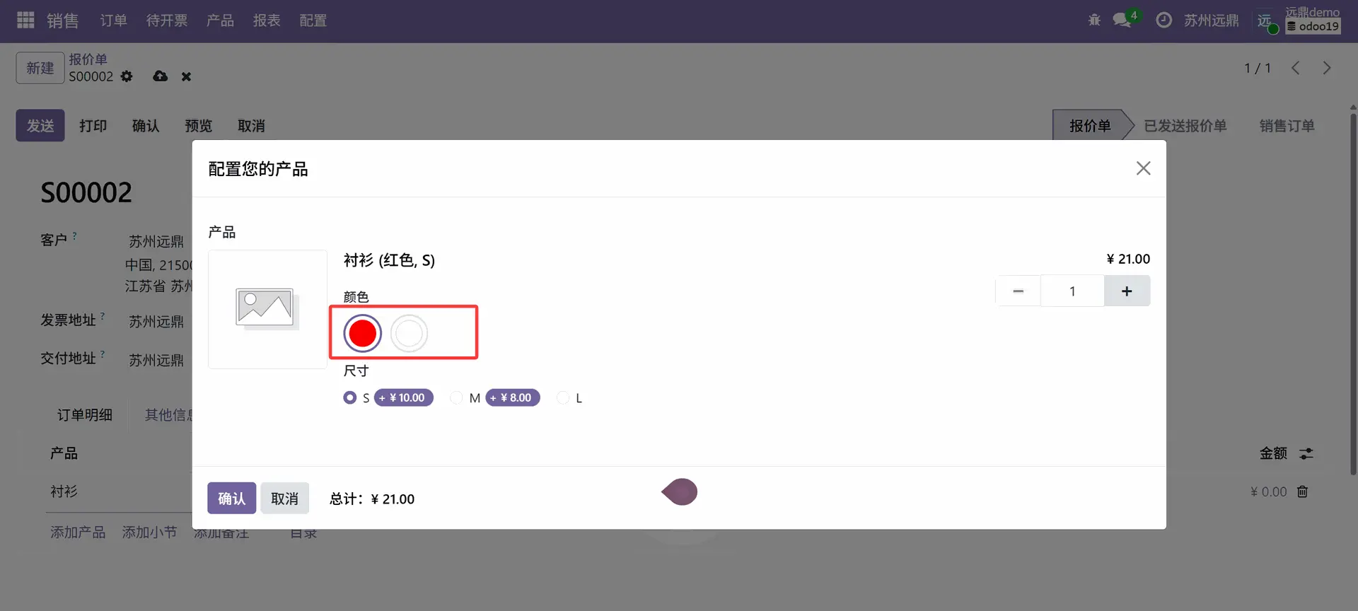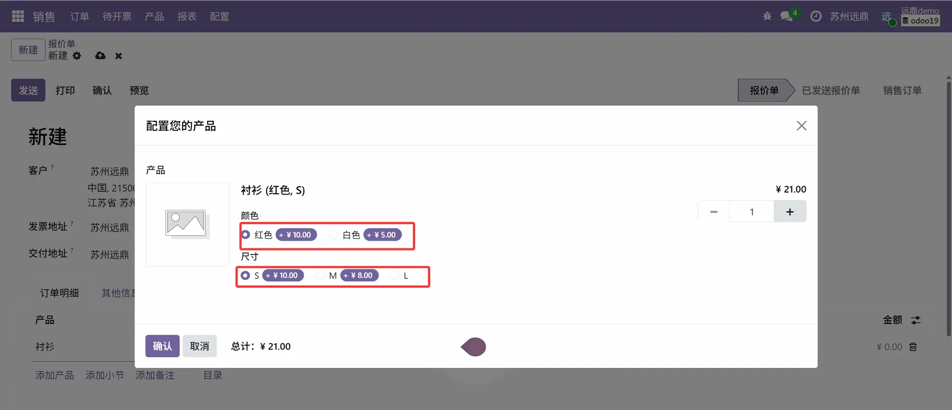 要查看不同显示类型的用法,请创建一个包含带有此已创建属性的产品的销售订单(Sale Order)。创建销售订单时,每当选择该产品时,都会显示一个弹出窗口,其中可见显示类型的视图,此弹出窗口包含所有属性值。在那里,可以选择任何需要的属性,并且也会显示附加价格。