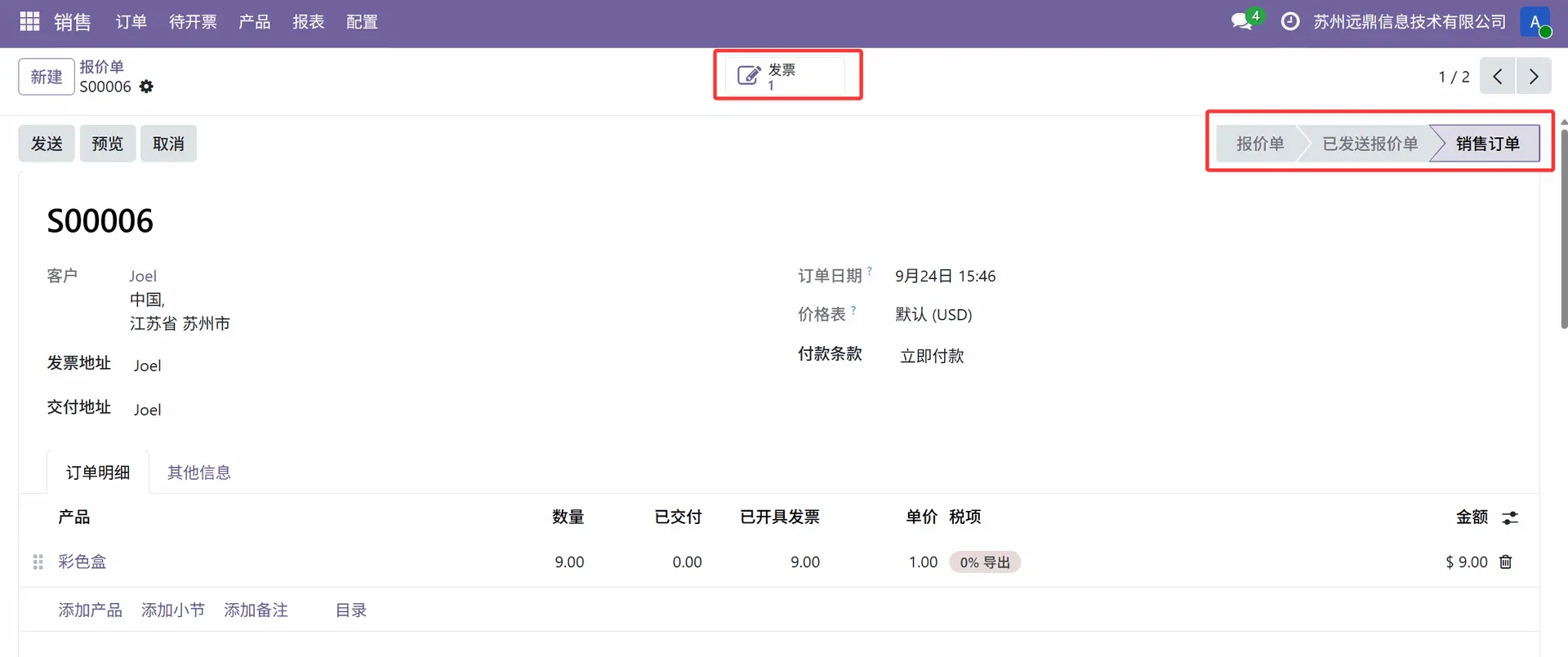 返回到销售订单 (Sales Order) 窗口,您将看到订单阶段已变为"销售订单" (Sale Order)。