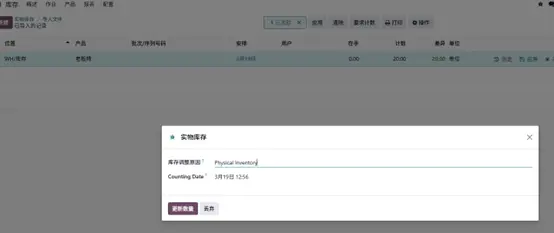 Odoo 提供了统一的 “实物盘点(Physical Inventory)” 功能,简化了期初库存录入、库存调整与修正的流程。