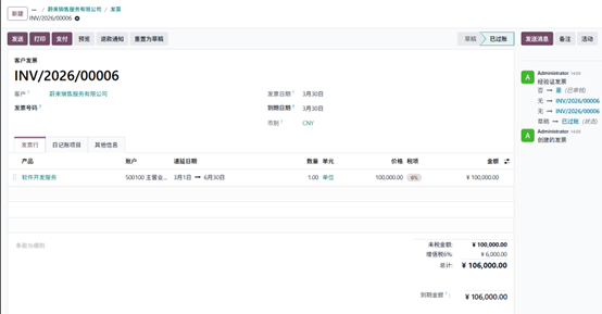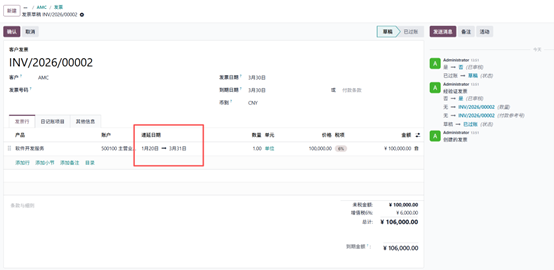 2. 创建新发票,客户仍为AMC,产品为订阅计划,设置递延期间为 2026 年 3 月 1 日至 2026 年 6 月 30 日,开票日期为 3 月 30日,确认发票。