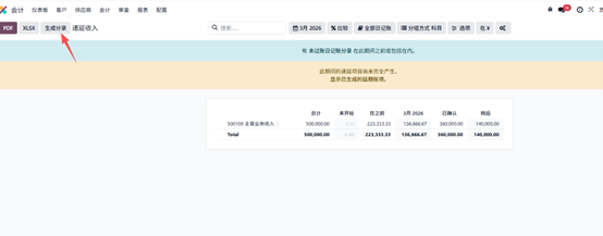 Odoo 提供了递延收入报表,用于生成并查看递延分录,该报表位于「调整分录」模块下。在审核菜单中选择递延收入报表即可打开。