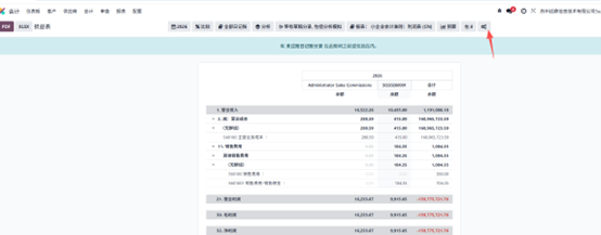7. 净利润(Net Profit):利润表最终展示的是所有收入扣除所有支出后的净额,即净利润。Odoo 通过汇总所选报告期内的所有入账数据计算该指标。该指标是评估企业业绩、制定投资决策或编制未来预算的核心依据,能直观反映企业真实盈利或亏损情况。