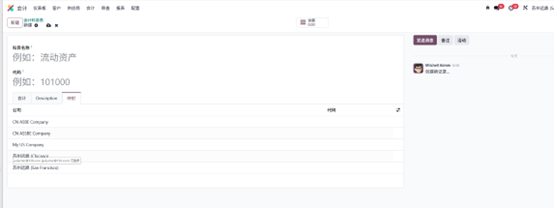 Odoo还支持用户通过【描述】标签页为科目补充更多说明信息,可记录关于该科目的补充备注或解释说明。这一功能对于明确科目核算用途、为财务团队提供内部操作指引尤为实用。此外,Odoo 19新增了科目映射功能,对于在同一系统中运营多家子公司、管理多个主体的企业而言,该功能具备极高的实用价值。