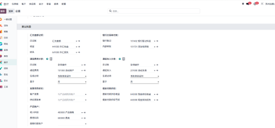 完成财务核算所需的基础科目配置后,下一步就是为特定的财务流程分配默认科目。通过默认科目配置,系统可将交易自动过账至对应科目,实现各类会计核算流程的自动化,进而提升核算准确性、减少人工操作。如需配置默认科目,可进入会计模块的【设置】菜单,在该页面中,有一个专门的【默认科目】标签页,用户可在此处定义Odoo在不同会计核算场景中自动调用的对应科目。