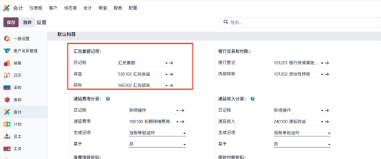 在该配置区域,用户需定义Odoo自动记录这些汇兑调整的对应科目与日记账。首先,选择对应的日记账,Odoo会将对账或重估过程中生成的汇率调整分录,过账至该日记账中。