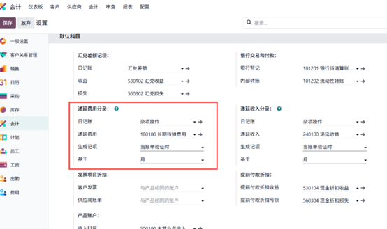 接下来,定义递延费用科目,该科目通常为流动资产类科目。记录预付费用时,金额将先计入该科目,而非一次性计入当期费用。后续,Odoo会按照预设的分摊周期,逐步将该科目余额结转至对应的费用科目。