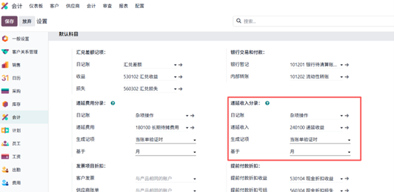 接下来,定义递延收入科目,该科目通常为负债类科目。收到客户的预付款时,金额将先作为未实现收入计入该科目。随着服务的逐步交付,Odoo会将该科目余额逐步结转至对应的收入科目,保障收入确认的准确性。【生成分录】选项,决定了系统生成分期收入确认分录的规则。若设置为【发票验证时】,一旦对应的客户发票完成验证,系统将自动生成收入确认计划。若选择【手动&批量】,财务人员可手动生成收入确认分录,通常可对多笔递延收入记录批量处理,让用户对分录的生成时点拥有更高的控制权。